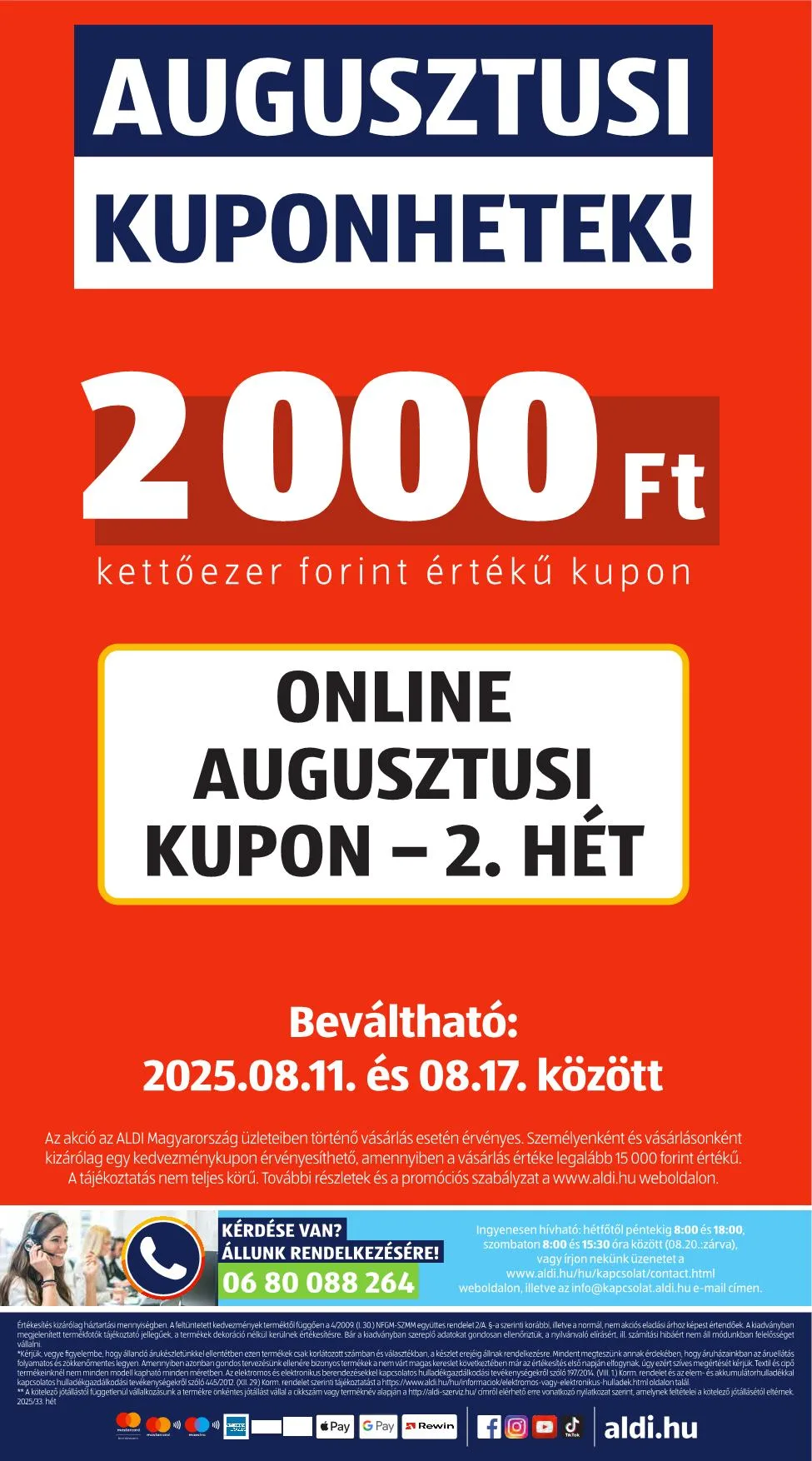 Ingyenesen hívható: hétfőtől péntekig 8:00 és 18:00, szombaton 8:00 és 15:30 óra között (08.20.: zárva), vagy írjon nekünk üzenetet a www.aldi.hu/hu/kapcsolat/contact.html weboldalon, illetve az [email protected] e-mail címen.