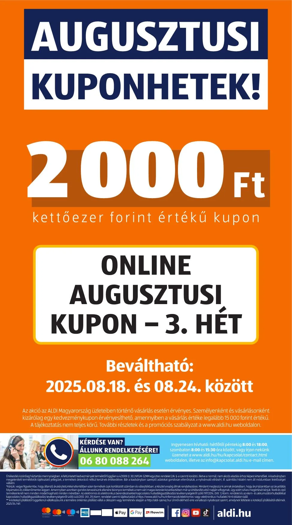 Az akció az ALDI Magyarország üzleteiben történő vásárlás esetén érvényes. Személyenként és vásárlásonként kizárólag egy kedvezménykupon érvényesíthető, amennyiben a vásárlás értéke legalább 15 000 forint értékű.