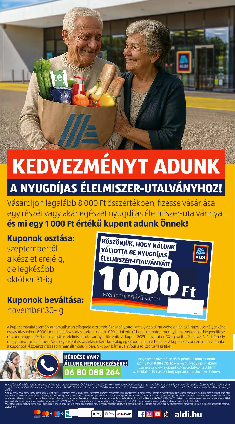 A kupont beváltó személy automatikusan elfogadja a promóciós szabályzatot, amely az aldi.hu weboldalon található. Személyenként és vásárlásonként 8 000 forintot elérő vásárlás esetén 1 darab 1000 forint értékű kupon adható, amennyiben a végösszeg kiegyenlítése részben vagy egészben nyugdíjas élelmiszer-utalvánnyal történik. A kupon 2025. november 30-ig váltható be az ALDI bármely magyarországi üzletében. Személyenként és vásárlásonként kizárólag egy kupon használható fel. A kupon készpénzre nem váltható, a kuponból készpénzt visszaadni nem áll módunkban. A kupon bármilyen típusú sokszorosítása tilos.