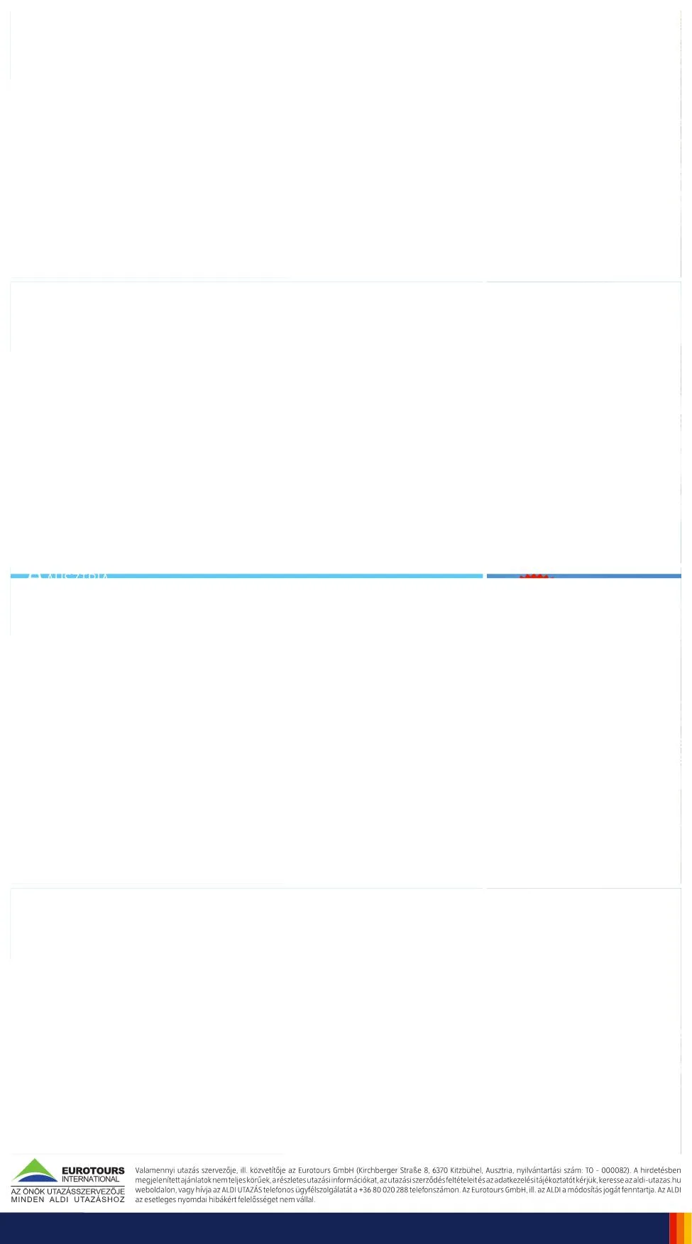 Valamennyi utazás szervezője, illetve közvetítője az Eurotours GmbH (Kirchberger Straße 8, 6370 Kitzbühel, Ausztria, nyilvántartási szám: TO – 000082). A hirdetésben megjelenített ajánlatok nem teljes körűek, a részletes utazási információkat, az utazási szerződés feltételeit és az adatkezelési tájékoztatót kérjük, keresse az aldi-utazas.hu weboldalon, vagy hívja az ALDI UTAZÁS telefonos ügyfélszolgálatát a +36 80 020 288 telefonszámon.