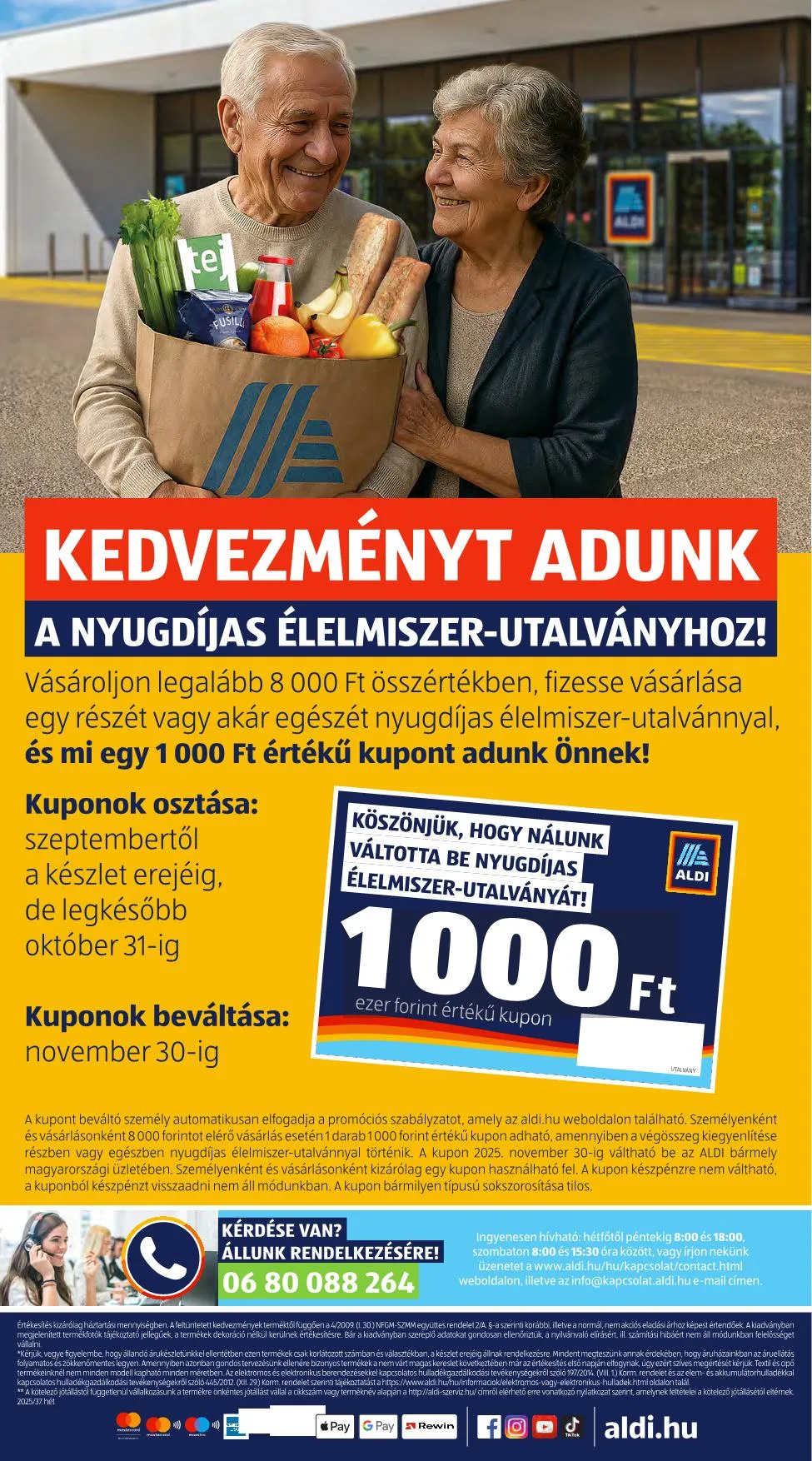 A kupont beváltó személy automatikusan elfogadja a promóciós szabályzatot, amely az aldi.hu weboldalon található. Személyenként és vásárlásonként 8000 forintot elérő vásárlás esetén 1 darab 1000 forint értékű kupon adható, amennyiben a végösszeg kiegyenlítése részben vagy egészben nyugdíjas élelmiszer-utalvánnyal történik. A kupon 2025. november 30-ig váltható be az ALDI bármely magyarországi üzletében. Személyenként és vásárlásonként kizárólag egy kupon használható fel. A kupon készpénzre nem váltható, a kuponból készpénzt visszaadni nem áll módunkban. A kupon bármilyen típusú sokszorosítása tilos.