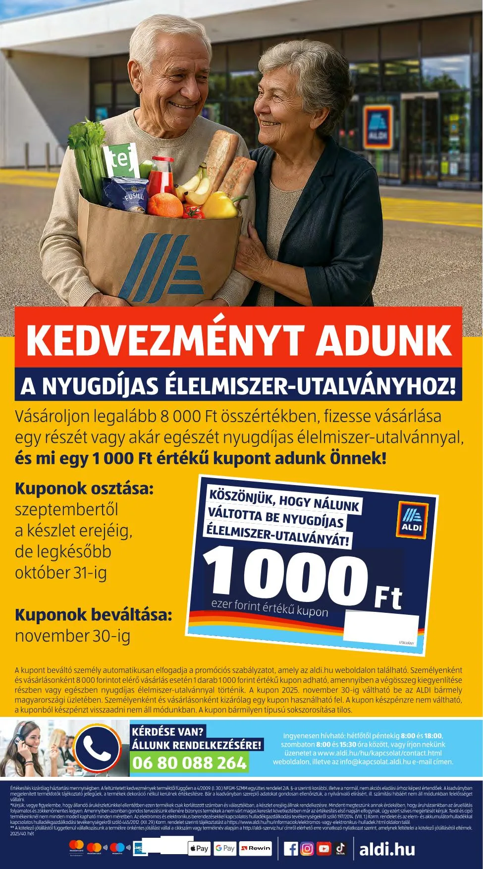 A kupont beváltó személy automatikusan elfogadja a promóciós szabályzatot, amely az aldi.hu weboldalon található. Személyenként és vásárlásonként 8 000 Ft forintot elérő vásárlás esetén 1 darab 1 000 Ft értékű kupon adható, amennyiben a végösszeg kiegyenlítése részben vagy egészben nyugdíjas élelmiszer-utalvánnyal történik. A kupon 2025. november 30-ig váltható be az ALDI bármely magyarországi üzletében. Személyenként és vásárlásonként kizárólag egy kupon használható fel. A kupon készpénzre nem váltható, a kuponból készpénzt visszaadni nem áll módunkban. A kupon bármilyen típusú sokszorosítása tilos.