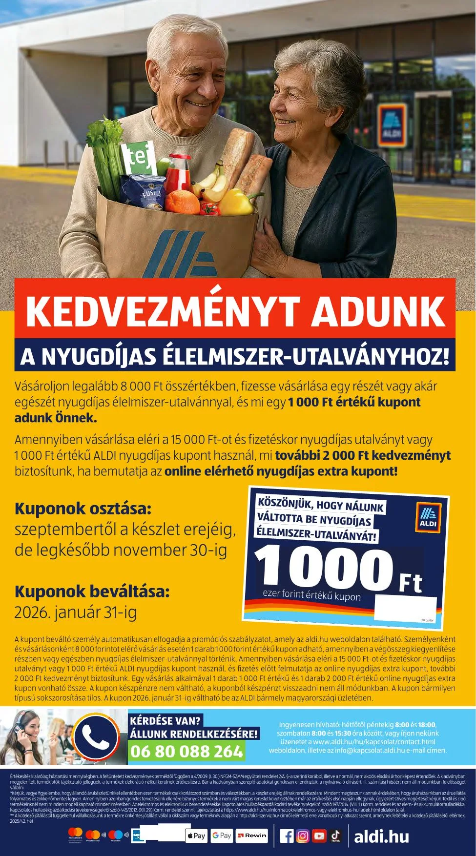 Egy vásárlás alkalmával 1 darab 1000 Ft értékű és 1 darab 2000 Ft értékű online nyugdíjas extra kupon vonható össze. A kupon készpénzre nem váltható, a kuponból készpénzt visszaadni nem áll módunkban. A kupon bármilyen típusú sokszorosítása tilos. A kupon 2026. január 31-ig váltható be az ALDI bármely magyarországi üzletében.