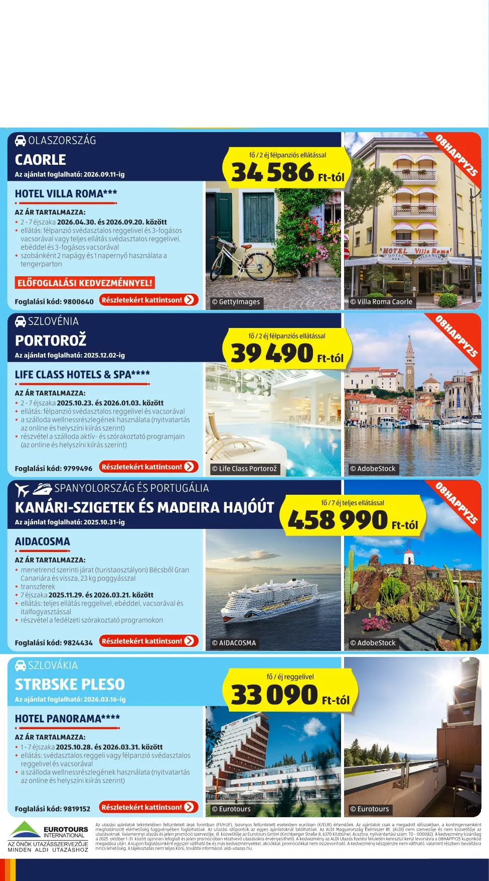 Az utazási ajánlatok tekintetében feltüntetett árak forintban (Ft/HUF), bizonyos feltüntetett esetekben euróban (€/EUR) értendők. Az ajánlatok csak a megadott időszakban, a kontingensenként meghatározott elérhetőség függvényében foglalhatóak. Az utazási időpontok az egyes ajánlatoknál találhatóak. Az ALDI Magyarország Élelmiszer Bt. (ALDI) nem szervezője és nem közvetítője az utazásoknak. Valamennyi utazás és jelen promóció szervezője, ill. közvetítője az Eurotours GmbH (Kirchberger Straße 8, 6370 Kitzbühel, Ausztria, nyilvántartási szám: TO-000082).