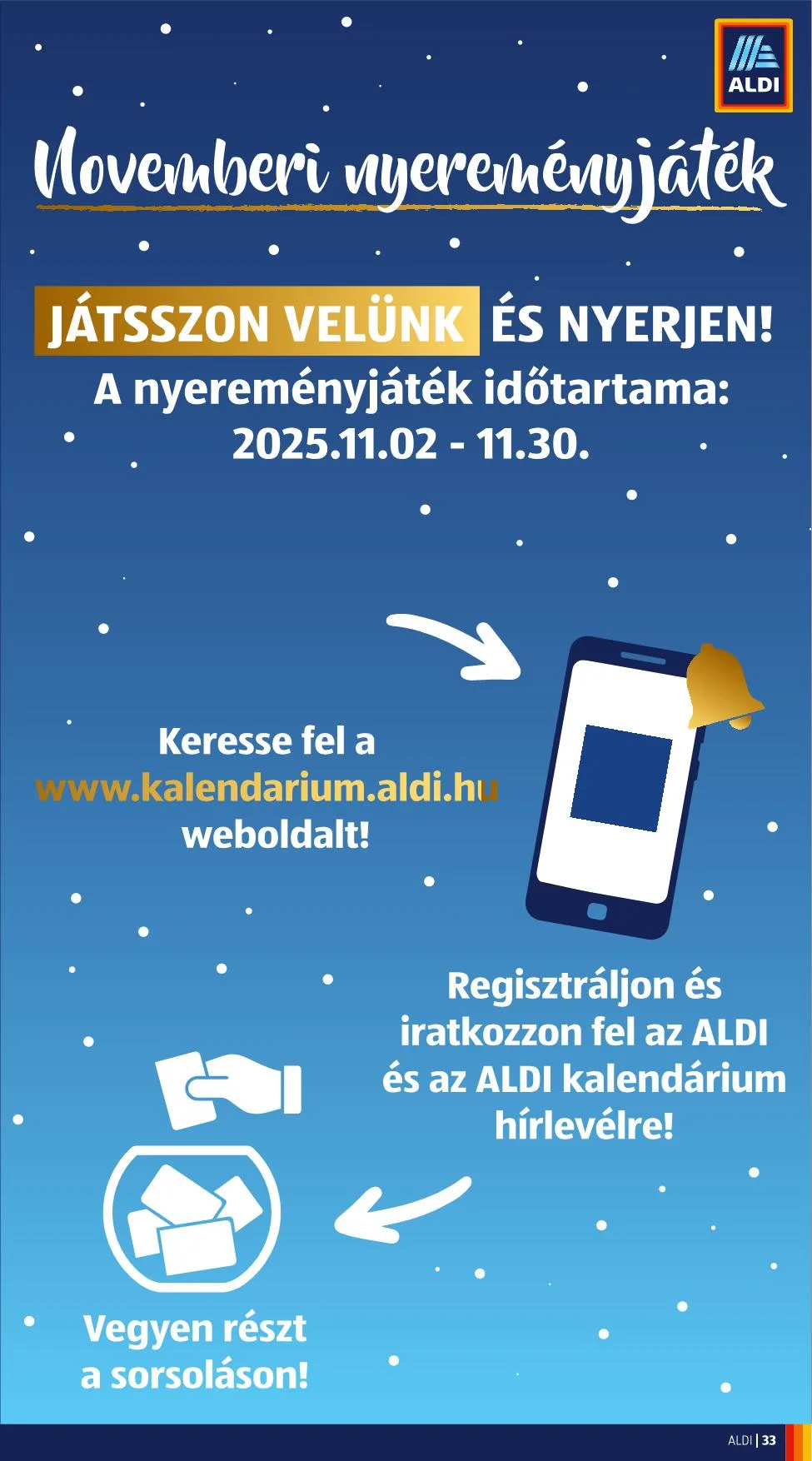 Ahhoz, hogy részt vehessen a novemberi nyereményjátékban, a név és elérhetőségi adatok megadása mellett fel kell iratkozni az ALDI és az ALDI Kalendárium hírlevélre a www.kalendarium.aldi.hu oldalon.