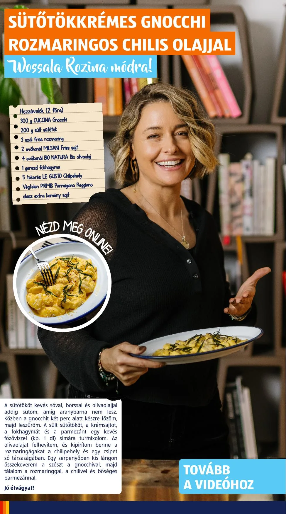 A sütőtököt kevés sóval, borssal és olívaolajjal addig sütöm, amíg aranybarna nem lesz. Közben a gnocchit két perc alatt készre főzöm, majd leszűröm. A sült sütőtököt, a krémsajtot, a fokhagymát és a parmezánt egy kevés főzővízzel (kb. 1 dl) simára turmixolom. Az olívaolajat felhevítem, és kipirítom benne a rozmaringágakat a chilipehely és egy csipet só társaságában. Egy serpenyőben kis lángon összekeverem a szószt a gnocchival, majd tálalom a rozmaringgal, a chilivel és bőséges parmezánnal.