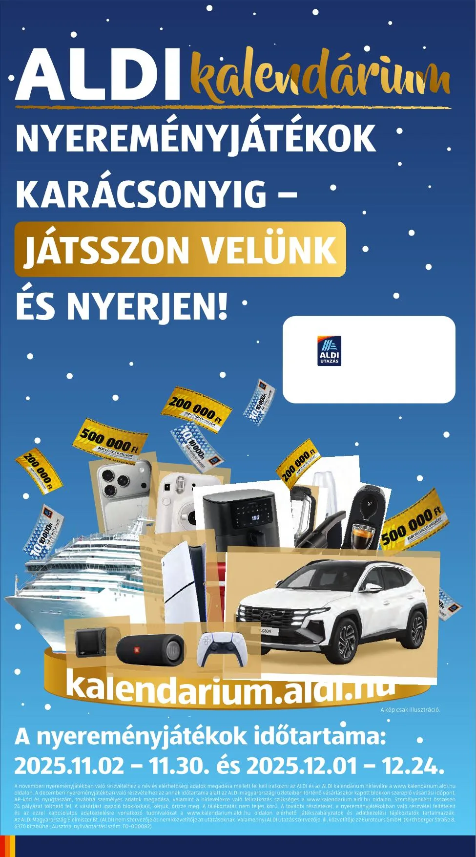 Személyenként összesen 24 pályázat tölthető fel. A vásárlást igazoló blokkokat kérjük, őrizze meg. A tájékoztatás nem teljes körű. A további részleteket, a nyereményjátékokban való részvétel feltételeit és az ezzel kapcsolatos adatkezelésre vonatkozó tudnivalókat a www.kalendarium.aldi.hu oldalon elérhető játékszabályzatok és adatkezelési tájékoztatók tartalmazzák.