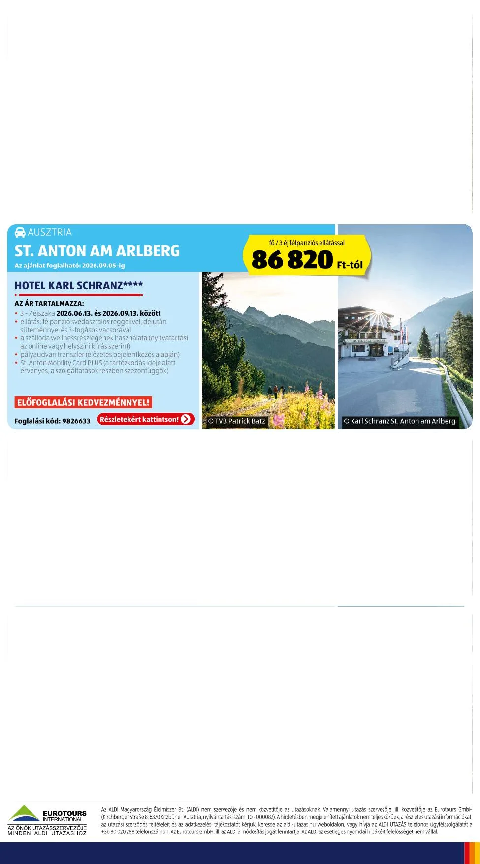 Az ALDI Magyarország Élelmiszer Bt. (ALDI) nem szervezője és nem közvetítője az utazásoknak. Valamennyi utazás szervezője, ill. közvetítője az Eurotours GmbH (Kirchberger Straße 8, 6370 Kitzbühel, Ausztria, nyilvántartási szám: TO-000082). A hirdetésben megjelenített ajánlatok nem teljes körűek. A részletes utazási információkat, az utazási szerződés feltételeit és az adatkezelési tájékoztatót kérjük, keresse az aldi-utazas.hu weboldalon, vagy hívja az ALDI UTAZÁS telefonos ügyfélszolgálatát a +36 80 020 288 telefonszámon. Az Eurotours GmbH, ill. az ALDI a módosítás jogát fenntartja. Az ALDI az esetleges nyomdai hibákért felelősséget nem vállal.