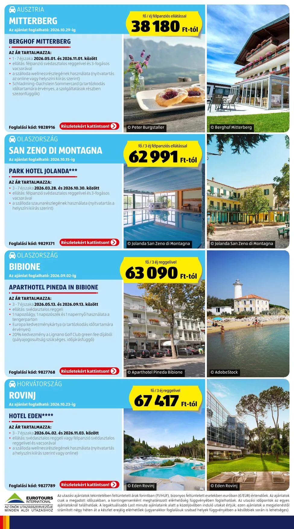 Az utazási ajánlatok tekintetében feltüntetett árak forintban (Ft/HUF), bizonyos feltüntetett esetekben euróban (E/EUR) értendőek. Az ajánlatok csak a megadott időszakban, a kontingensenként meghatározott elérhetőség függvényében foglalhatóak. Az utazási időpontok az egyes ajánlatoknál találhatóak. A legaktuálisabb Last minute ajánlataink alatt a közeljövőben induló utakat értjük; ezen ajánlatok a megjelenéstől számított négy héten át a készlet erejéig elérhetőek (ugyanakkor foglalásuk szabad helyek függvényében a későbbiek során is lehetséges).