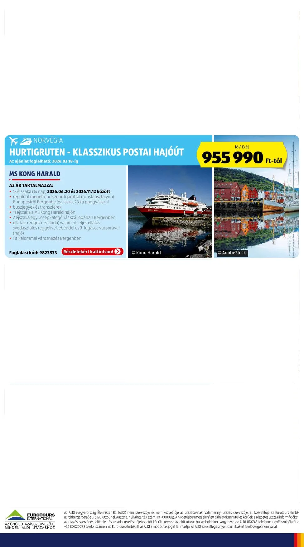 A hirdetésben megjelenített ajánlatok nem teljes körűek, a részletes utazási információkat, az utazási szerződés feltételeit és az adatkezelési tájékoztatót kérjük, keresse az aldi-utazas.hu weboldalon, vagy hívja az ALDI UTAZÁS telefonos ügyfélszolgálatát a +36 80 020 288 telefonszámon.