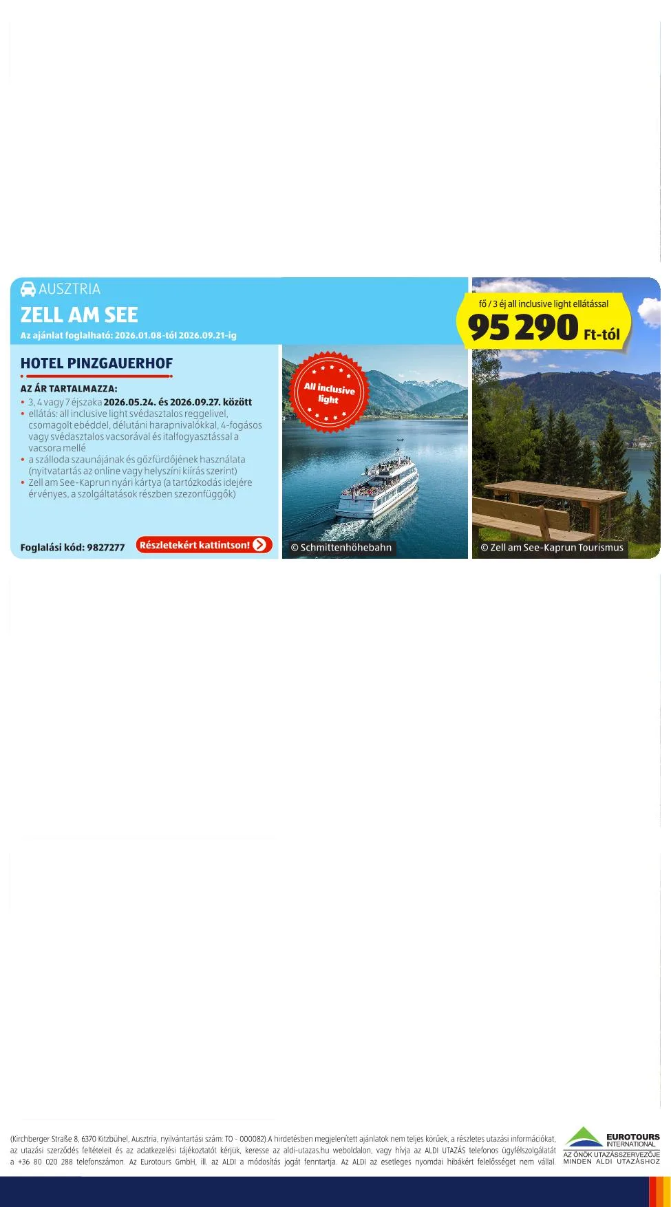 Az utazási ajánlatok tekintetében feltüntetett árak forintban (Ft/HUF), bizonyos feltüntetett esetekben euróban (E/EUR) értendőek. Az ajánlatok csak a megadott időszakban, a kontingensenként meghatározott elérhetőség függvényében foglalhatóak. Az utazási időpontok az egyes ajánlatoknál találhatóak. Az ALDI Magyarország Élelmiszer Bt. (ALDI) nem szervezője és nem közvetítője az utazásoknak, és a NAGY ELŐFOGLALÁSI AKCIÓNAK. Valamennyi utazás és a NAGY ELŐFOGLALÁSI AKCIÓ szervezője, ill. közvetítője az Eurotours GmbH.