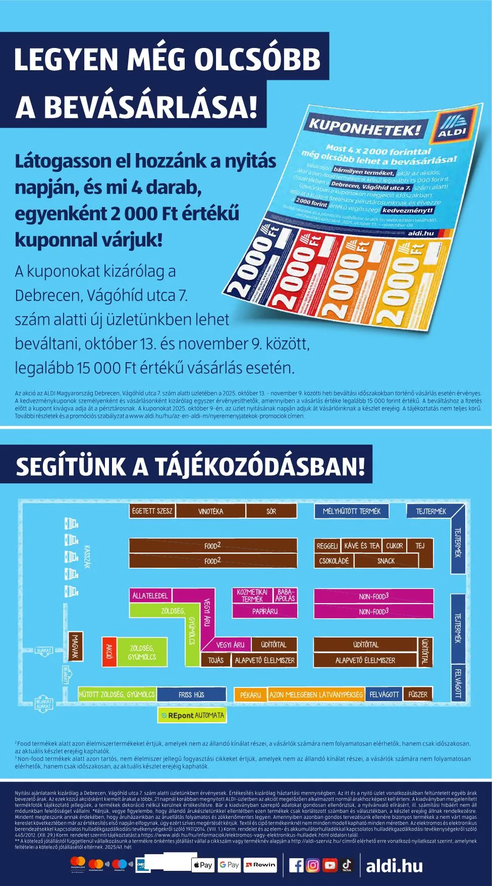 Az akció az ALDI Magyarország Debrecen, Vágóhíd utca 7. szám alatti üzletében az említett időszakokban érvényes. A kedvezménykuponok személyenként és vásárlásonként kizárólag egyszer érvényesíthetők.
