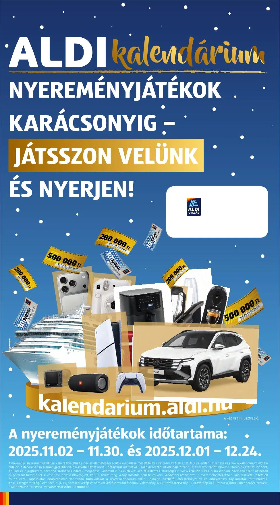A tájékoztatás nem teljes körű. A további részleteket, a nyereményjátékokban való részvétel feltételeit és az ezzel kapcsolatos adatkezelésre vonatkozó tudnivalókat a www.kalendarium.aldi.hu oldalon elérhető játékszabályzatok és adatkezelési tájékoztatók tartalmazzák.