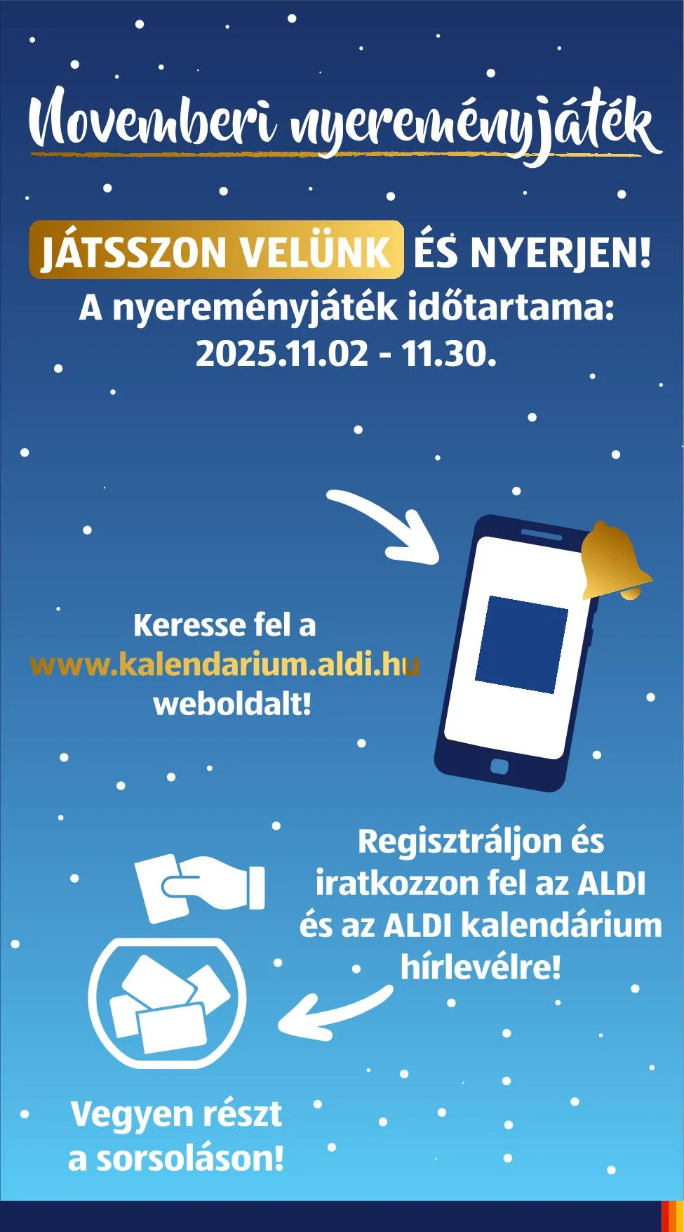 A novemberi nyereményjátékban való részvételhez a név és elérhetőségi adatok megadása mellett fel kell iratkozni az ALDI és az ALDI kalendárium hírlevélre a www.kalendarium.aldi.hu oldalon.
