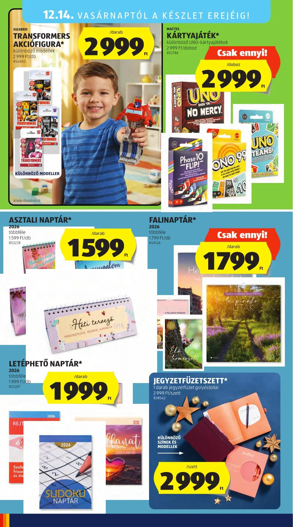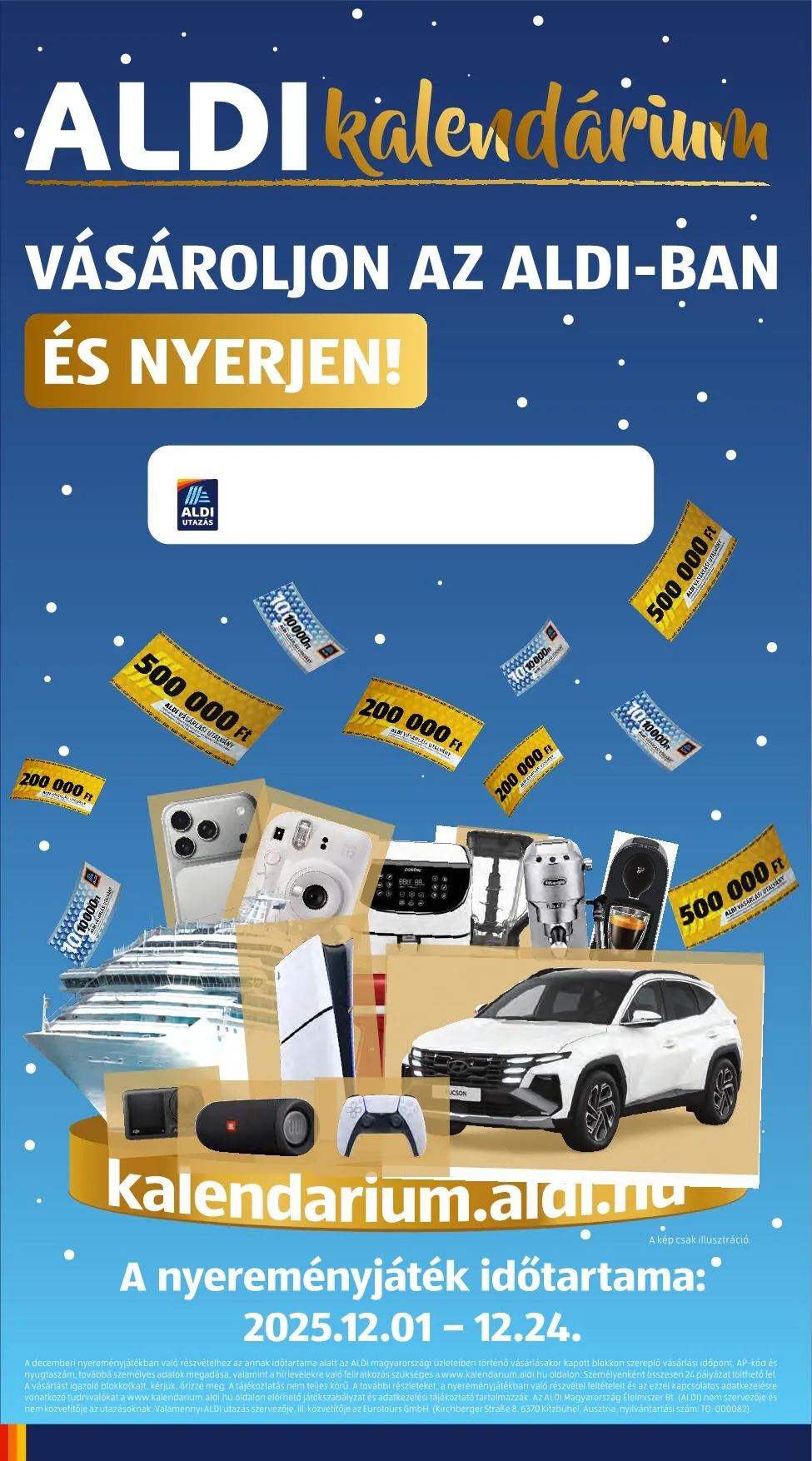 A vásárlást igazoló blokkokat kérjük, őrizze meg. A tájékoztatás nem teljes körű. A további részleteket, a nyereményjátékban való részvétel feltételeit és az ezzel kapcsolatos adatkezelésre vonatkozó tudnivalókat a www.kalendarium.aldi.hu oldalon elérhető játékszabályzat és adatkezelési tájékoztató tartalmazzák.