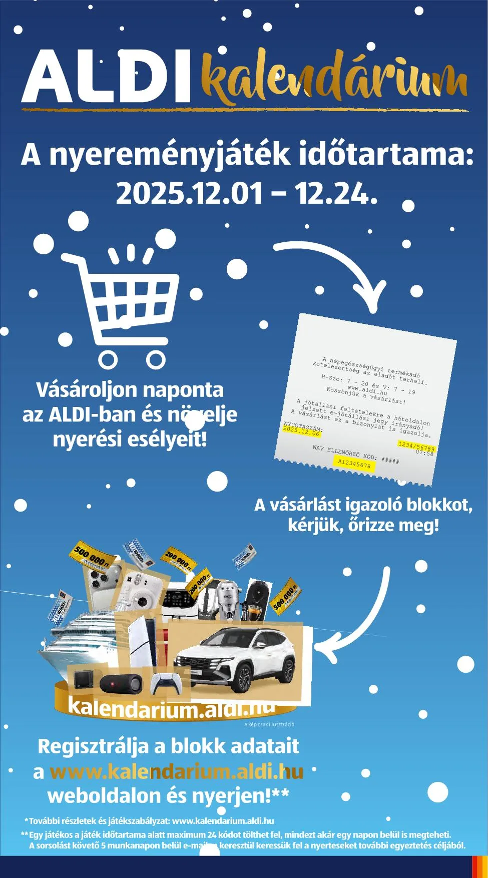 A decemberi nyereményjátékban való részvételhez az időtartama alatt az ALDI magyarországi üzleteiben történő vásárlásakor kapott blokkon szereplő vásárlási időpont, AP-kód és nyugtaszám, valamint személyes adatok megadása és a hírlevelekre való feliratkozás szükséges a www.kalendarium.aldi.hu oldalon.
