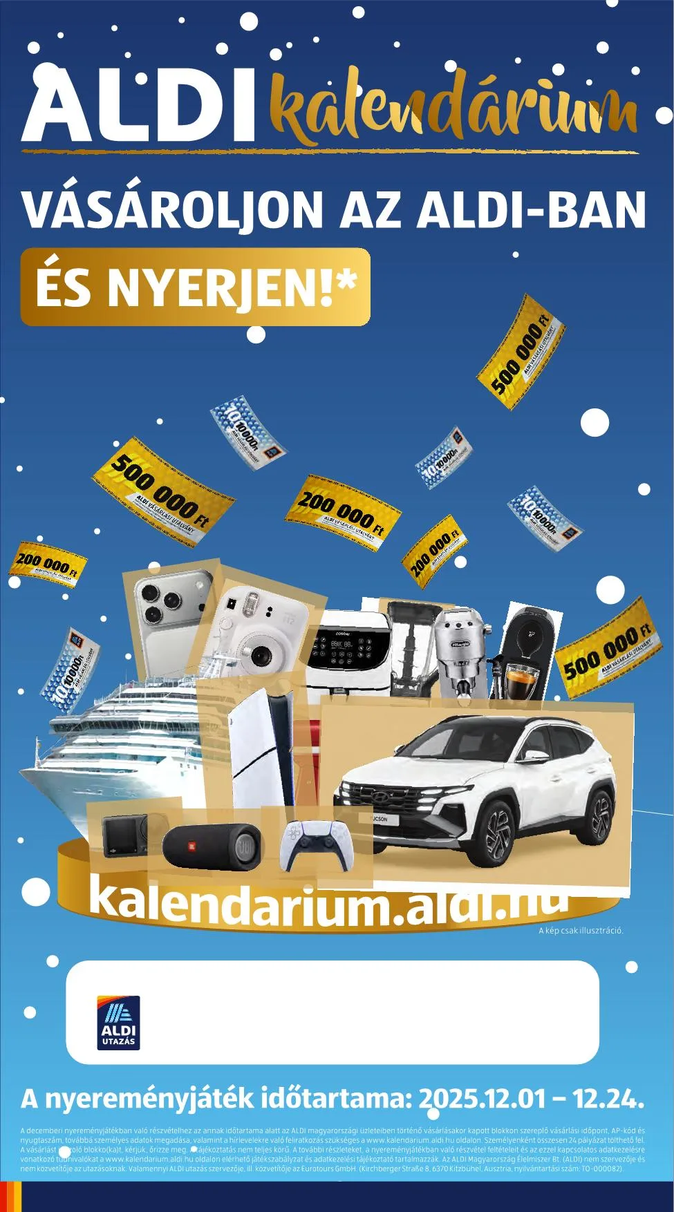 Személyenként összesen 24 pályázat tölthető fel. A vásárlást igazoló blokkokat kérjük, őrizze meg! Az információ nem teljes körű. A további részleteket, a nyereményjátékban való részvétel feltételeit és az ezzel kapcsolatos adatkezelésre vonatkozó tudnivalókat a www.kalendarium.aldi.hu oldalon elérhető játékszabályzat és adatkezelési tájékoztató tartalmazzák.