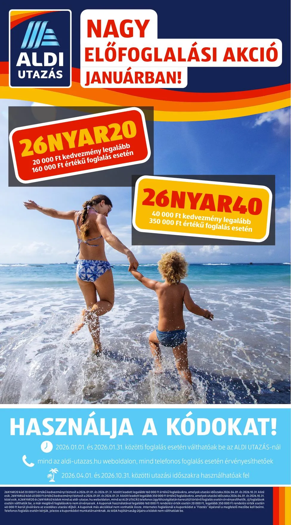 A 26NYAR20 és 26NYAR40 kódok mind az aldi-utazas.hu weboldalon, mind az ALDI UTAZÁS telefonos ügyfélszolgálatán keresztül történő foglalás esetén érvényesek.