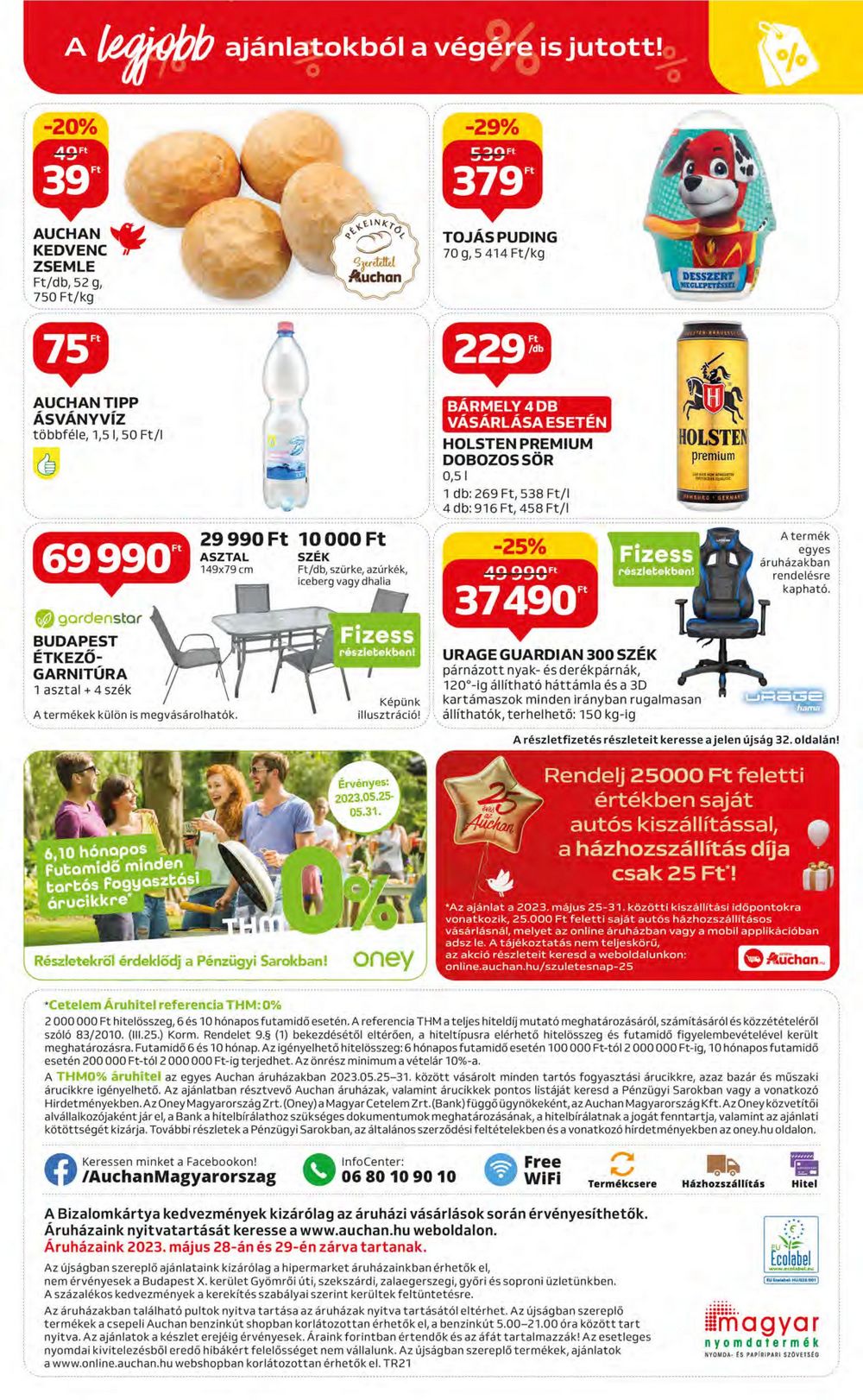 A legjobb ajánlatokból a végére is jutott! -29% 539Ft 379 -20% 49 Ft 39 Ft AUCHAN KEDVENC ZSEMLE Ft/db, 52 g, 750 Ft/kg 75″ AUCHAN TIPP ÁSVÁNYVÍZ többféle, 1,5 1,50 Ft/l 69 990ft gardenstar BUDAPEST ÉTKEZŐ- 6,10 hónapos Futamidő minden tartós fogyasztási árucikkre 29 990 Ft 10 000 Ft SZÉK Ft/db, szürke, azúrkék, iceberg vagy dhalia ASZTAL 149×79 cm GARNITÚRA 1 asztal + 4 szék A termékek külön is megvásárolhatók. Szeretettel Auchan Fizess részletekben! Képünk illusztráció! Keressen minket a Facebookon! /AuchanMagyarorszag Érvényes: 2023.05.25- 05.31. W Részletekről érdeklődj a Pénzügyi Sarokban! oney TOJÁS PUDING 70 g, 5 414 Ft/kg Ft 229 BÁRMELY 4 DB VÁSÁRLÁSA ESETÉN Ft /db HOLSTEN PREMIUM DOBOZOS SÖR 0,51 1 db: 269 Ft, 538 Ft/l 4 db: 916 Ft, 458 Ft/l -25% 49 990Ft 37490⁰ All Auchan InfoCenter: 06 80 10 90 10 URAGE GUARDIAN 300 SZÉK párnázott nyak- és derékpárnák, 120°-ig állítható háttámla és a 3D kartámaszok minden irányban rugalmasan állíthatók, terhelhető: 150 kg-ig DESSZERT MEGLEPETÉSser KITAN-MRAVESSE Fizess részletekben! HOLSTEN premium Free WiFi Termékcsere SURG GERNA A Bizalomkártya kedvezmények kizárólag az áruházi vásárlások során érvényesíthetők. Áruházaink nyitvatartását keresse a www.auchan.hu weboldalon. Áruházaink 2023. május 28-án és 29-én zárva tartanak. Az újságban szereplő ajánlataink kizárólag a hipermarket áruházainkban érhetők el, nem érvényesek a Budapest X. kerület Gyömrői úti, szekszárdi, zalaegerszegi, győri és soproni üzletünkben. A százalékos kedvezmények a kerekítés szabályai szerint kerültek feltüntetésre. N A részletfizetés részleteit keresse a jelen újság 32. oldalán! Az áruházakban található pultok nyitva tartása az áruházak nyitva tartásától eltérhet. Az újságban szereplő termékek a csepeli Auchan benzinkút shopban korlátozottan érhetők el, a benzinkút 5.00-21.00 óra között tart nyitva. Az ajánlatok a készlet erejéig érvényesek. Áraink forintban értendők és az áfát tartalmazzák! Az esetleges nyomdai kivitelezésből eredő hibákért felelősséget nem vállalunk. Az újságban szereplő termékek, ajánlatok a www.online.auchan.hu webshopban korlátozottan érhetők el. TR21 A termék egyes áruházakban rendelésre kapható. Rendelj 25000 Ft feletti értékben saját autós kiszállítással, a házhozszállítás díja csak 25 Ft! *Az ajánlat a 2023. május 25-31. közötti kiszállítási időpontokra vonatkozik, 25.000 Ft feletti saját autós házhozszállításos vásárlásnál, melyet az online áruházban vagy a mobil applikációban adsz le. A tájékoztatás nem teljeskörű, az akció részleteit keresd a weboldalunkon: Auchan online.auchan.hu/szuletesnap-25 *Cetelem Áruhitel referencia THM: 0% 2 000 000 Ft hitelösszeg, 6 és 10 hónapos futamidő esetén. A referencia THM a teljes hiteldíj mutató meghatározásáról, számításáról és közzétételéről szóló 83/2010. (III.25.) Korm. Rendelet 9.§ (1) bekezdésétől eltérően, a hiteltípusra elérhető hitelösszeg és futamidő figyelembevételével került meghatározásra. Futamidő 6 és 10 hónap. Az igényelhető hitelösszeg: 6 hónapos futamidő esetén 100 000 Ft-tól 2 000 000 Ft-ig, 10 hónapos futamidő esetén 200 000 Ft-tól 2 000 000 Ft-ig terjedhet. Az önrész minimum a vételár 10%-a. URAGE A THM0% áruhitel az egyes Auchan áruházakban 2023.05.25-31. között vásárolt minden tartós fogyasztási árucikkre, azaz bazár és műszaki árucikkre igényelhető. Az ajánlatban résztvevő Auchan áruházak, valamint árucikkek pontos listáját keresd a Pénzügyi Sarokban vagy a vonatkozó Hirdetményekben. Az Oney Magyarország Zrt. (Oney) a Magyar Cetelem Zrt. (Bank) függő ügynökeként, az Auchan Magyarország Kft. Az Oney közvetítői alvállalkozójaként jár el, a Bank a hitelbírálathoz szükséges dokumentumok meghatározásának, a hitelbírálatnak a jogát fenntartja, valamint az ajánlati kötöttségét kizárja. További részletek a Pénzügyi Sarokban, az általános szerződési feltételekben és a vonatkozó hirdetményekben az oney.hu oldalon. hama Házhozszállítás Hitel Ecolabel 001 magyar nyomdatermék NYOMDA- ÉS PAPÍRIPARI SZÖVETSÉG