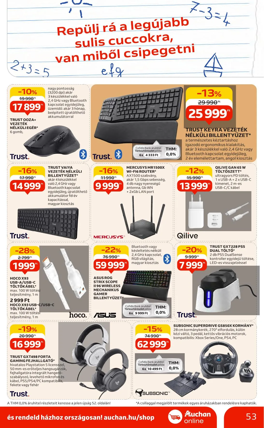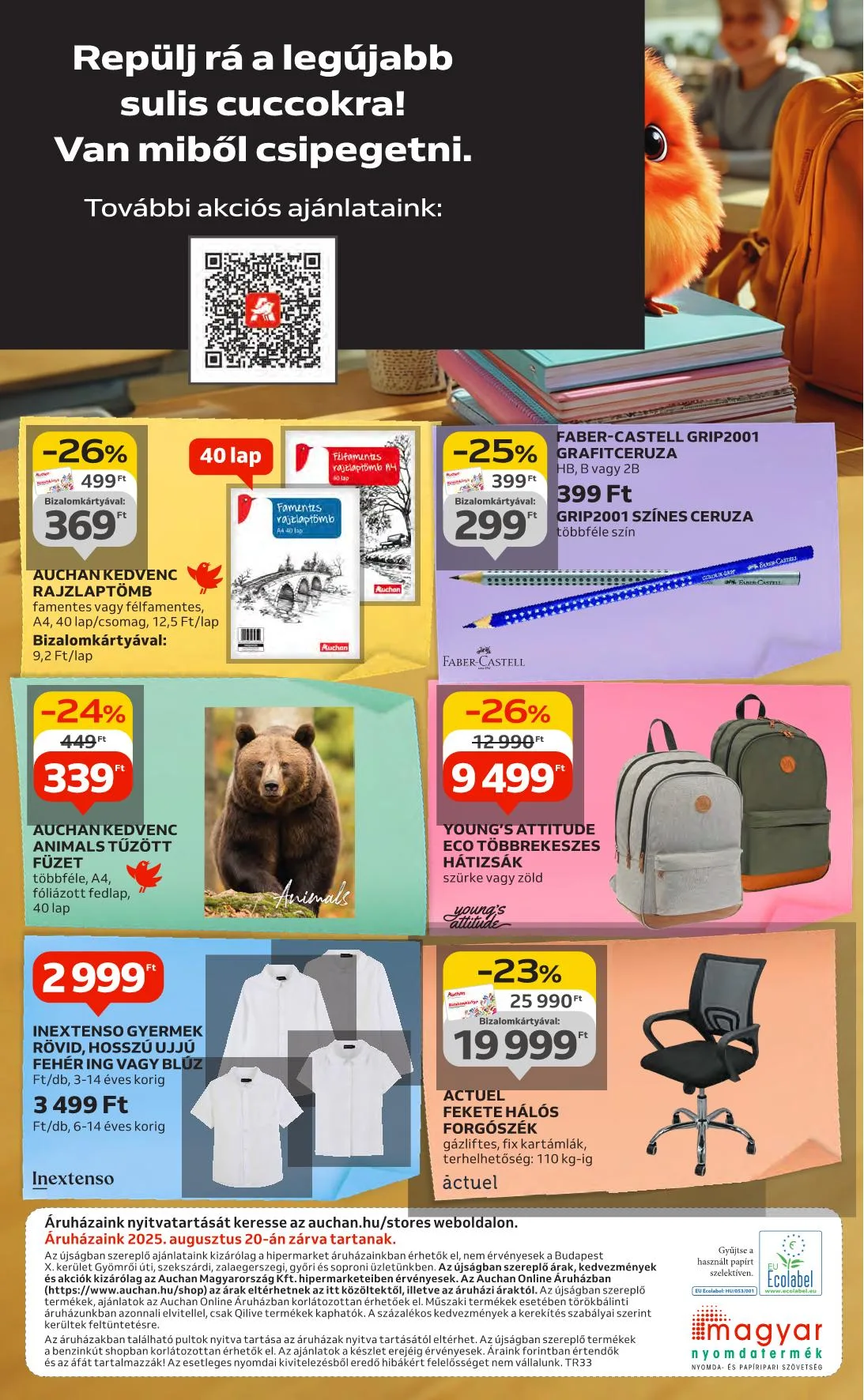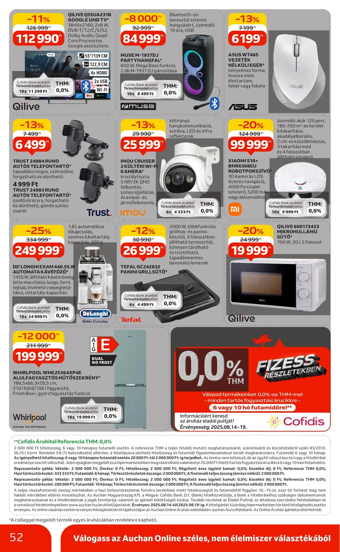 2 000 000 Ft hitelösszeg, 6 vagy 10 hónapos futamidő esetén. A referencia THM a teljes hiteldíj mutató meghatározásáról, számításáról és közzétételéről szóló 83/2010. (III.25.) Korm. rendelet 9.§ (1) bekezdésétől eltérően, a hiteltípusra elérhető hitelösszeg és futamidő figyelembevételével került meghatározásra. Futamidő 6 vagy 10 hónap. Az igényelhető hitelösszeg: 6 vagy 10 hónapos futamidő esetén 20 000 Ft-tól 2 000 000 Ft-ig terjedhet. Az önrész nem kötelező, de az ügyfél választása és/vagy a hitelbírálat eredménye szerint változhat. Jelen újságban megjelölt és a hipermarketekben megvásárolható valamennyi 20 000 Ft feletti tartós fogyasztási árucikkre 6 vagy 10 havi futamidőre. Reprezentatív példa: Vételár: 2 000 000 Ft; Önrész: 0 Ft; Hitelösszeg: 2 000 000 Ft; Rögzített éves ügyleti kamat: 0,0%; Kezelési díj: 0 Ft; Referencia THM 0,0%; Havi törlesztőrészlet: 333 333 Ft; Futamidő: 6 hónap; Törlesztőrészletek összege: 2 000 000 Ft; A fizetendő teljes összeg (önrész nélkül): 2 000 000 Ft. Reprezentatív példa: Vételár: 2 000 000 Ft; Önrész: 0 Ft; Hitelösszeg: 2 000 000 Ft; Rögzített éves ügyleti kamat: 0,0%; Kezelési díj: 0 Ft; Referencia THM 0,0%; Havi törlesztőrészlet: 200 000 Ft; Futamidő: 10 hónap; Törlesztőrészletek összege: 2 000 000 Ft; A fizetendő teljes összeg (önrész nélkül): 2 000 000 Ft. A teljes visszafizetendő összeg mértékében a havi törlesztőrészletek forintra kerekítése miatt hitelösszegtől és futamidőtől függően 10 Ft-ot, azaz tíz forintot meg nem haladó mértékben eltérés mutatkozhat. Az Auchan Magyarország Kft. a Magyar Cofidis Bank Zrt. (Bank) hitelközvetítője, a Bank a hitelbírálathoz szükséges dokumentumok meghatározásának és a hitelbírálatnak a jogát fenntartja, valamint az ajánlati kötöttségét kizárja. További részletek az Eladói Pultnál, az általános szerződési feltételekben és a vonatkozó hirdetményekben: www.auchan.hu/aruhitel/ajanlatok. Érvényes: 2025.08.14-tól 2025.08.19-ig. A hitelajánlat kizárólag hipermarketben történő hiteligénylés esetén érvényes. Az online vásárlás esetén érvényes hitelajánlatokról tájékozódjon az Auchan Online Áruház weboldalán: auchan.hu/cofidisbank. Az Online Áruház ajánlatai eltérhetnek.
