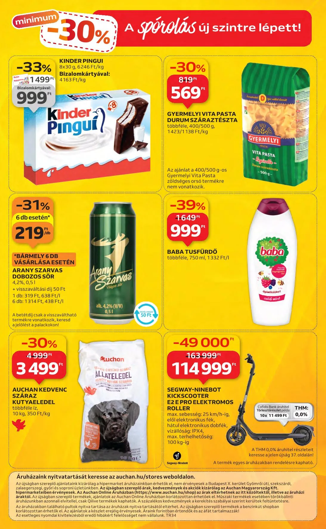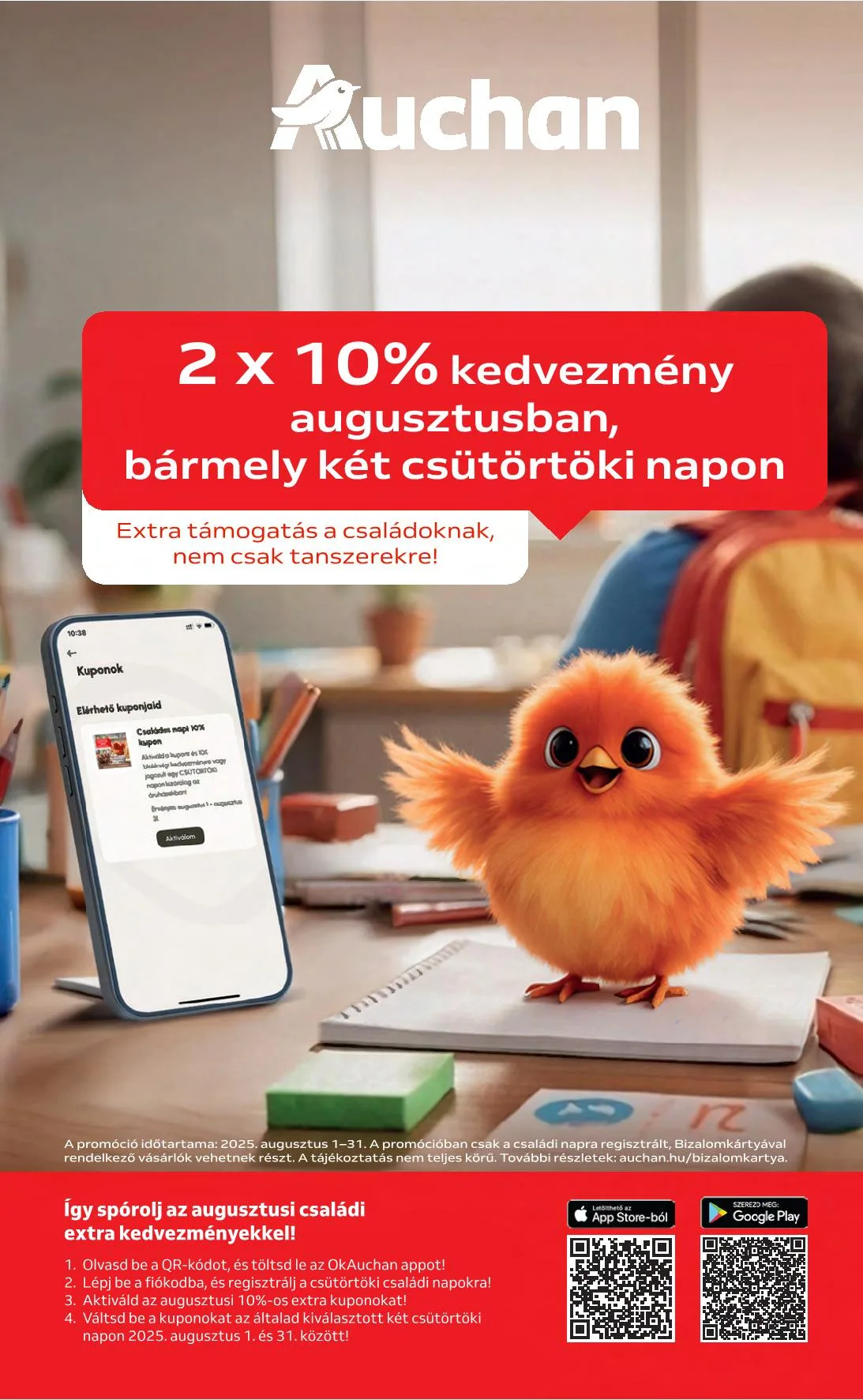 Az újságban szereplő ajánlataink kizárólag a hipermarket áruházainkban érhetők el, nem érvényesek a Budapest X. kerület Gyömrői úti, szekszárdi, zalaegerszegi, győri és soproni üzletünkben. Az újságban szereplő árak, kedvezmények és akciók kizárólag az Auchan Magyarország Kft. hipermarketeiben érvényesek. Az Auchan Online Áruházban (https://www.auchan.hu/shop) az árak eltérhetnek az itt közöltektől, illetve az áruházi áraktól.