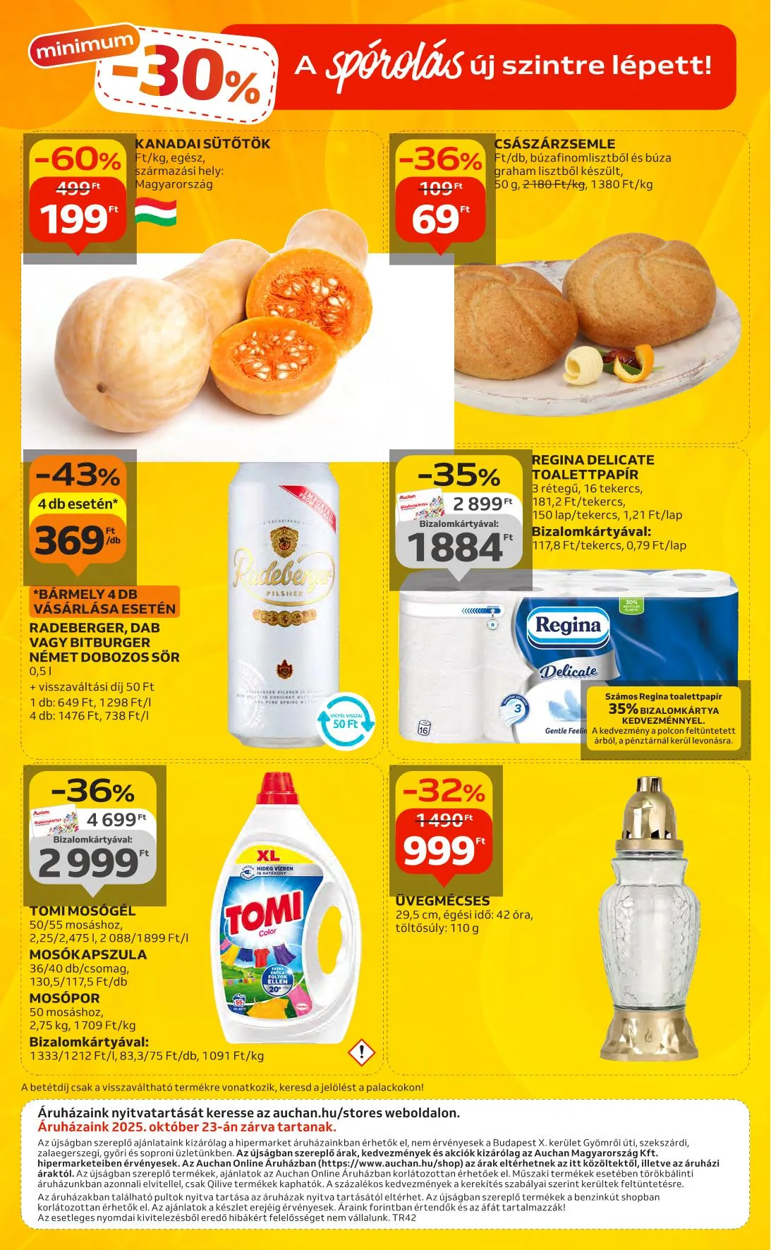 A kedvezmény a polcon feltüntetett árból a pénztárnál kerül levonásra. Az újságban szereplő ajánlataink kizárólag a hipermarket áruházainkban érhetők el, nem érvényesek a Budapest X. kerület Gyömrői úti, szekszárdi, zalaegerszegi, győri és soproni üzletünkben.