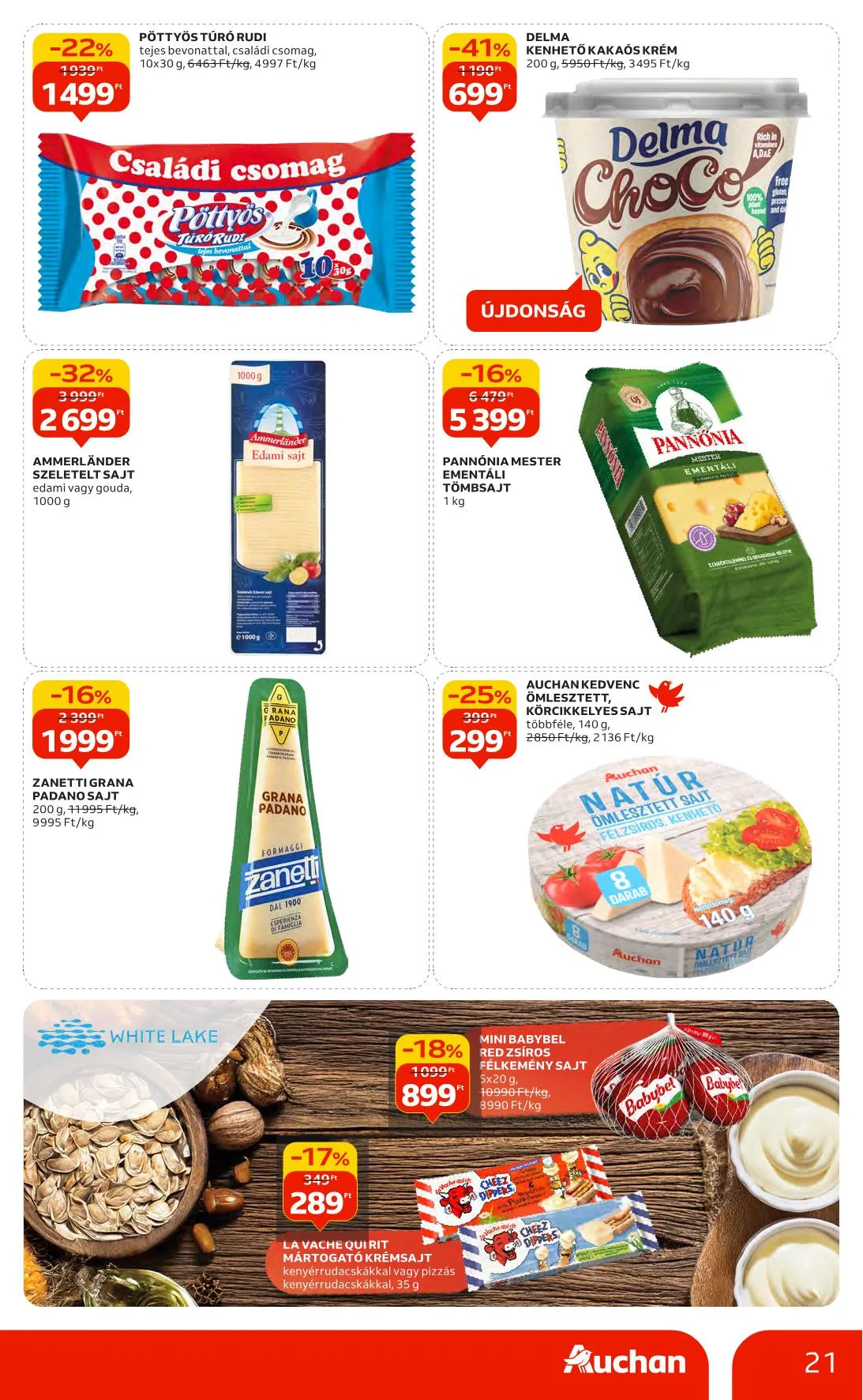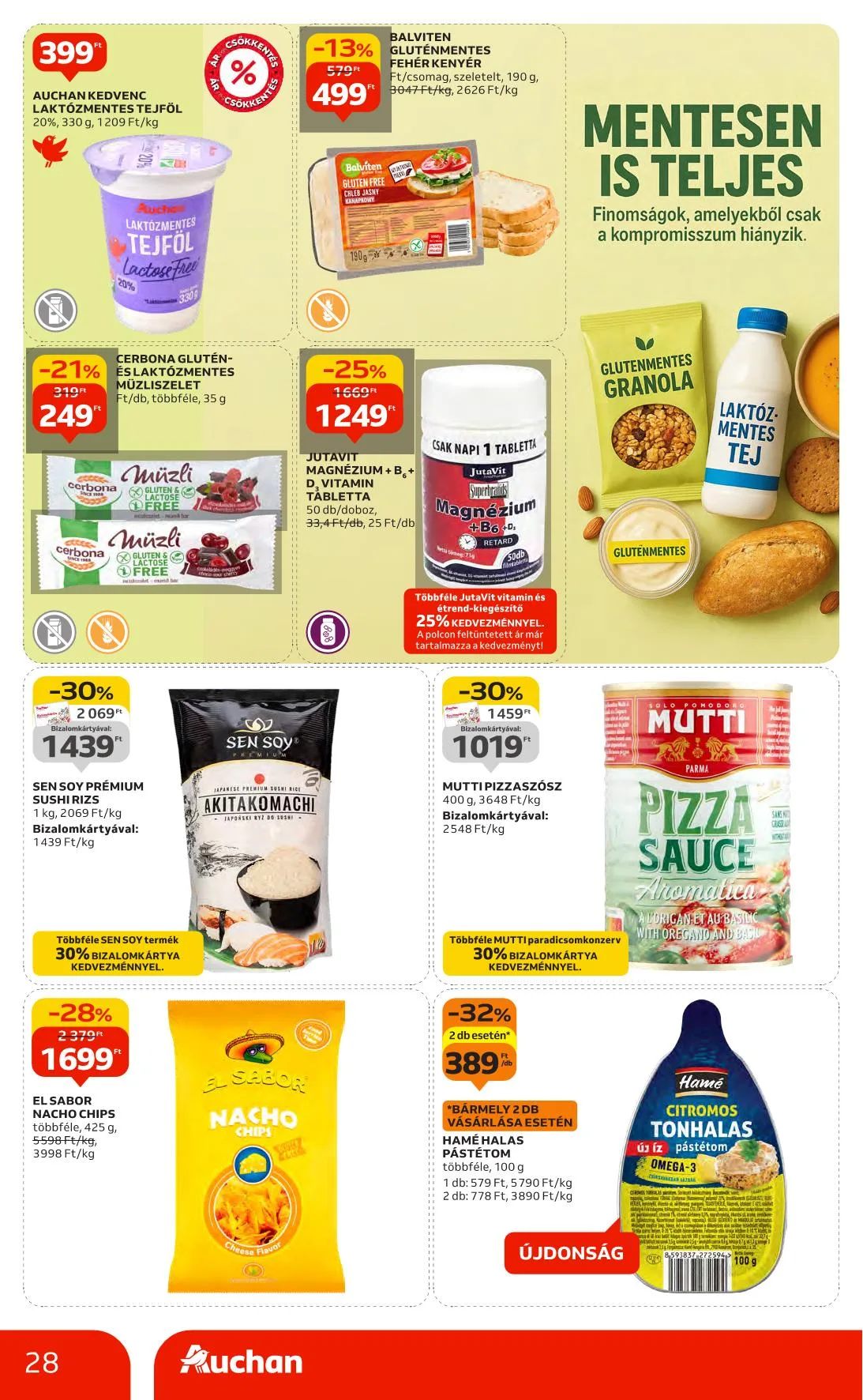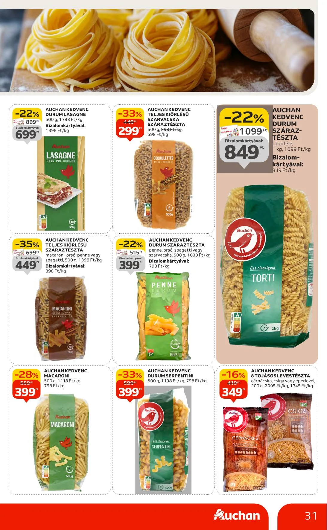 - -25% Auchan Kedvenc Bauletto toast szeletek: 599 Ft, 449 Ft, teljes kiőrlésű, fehér, durum vagy 8 gabonás, szeletelt, csomagolt, 400 g, 1498 Ft/kg, 1123 Ft/kg