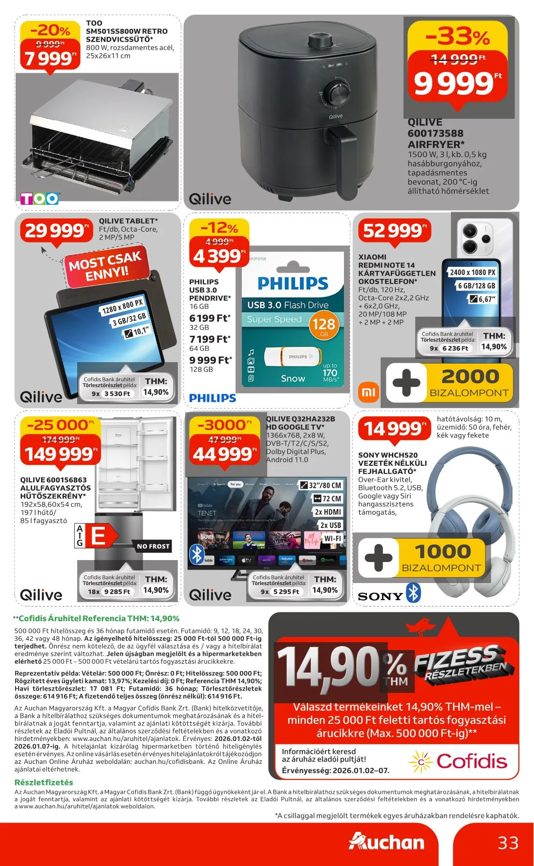500 000 Ft hitelösszeg és 36 hónap futamidő esetén. Az igényelhető hitelösszeg: 25 000 Ft-tól 500 000 Ft-ig terjedhet. Jelen újságban megjelölt és a hipermarketekben elérhető 25 000 Ft – 500 000 Ft vételárú tartós fogyasztási árucikkekre. Érvényes: 2026.01.02-tól 2026.01.07-ig.