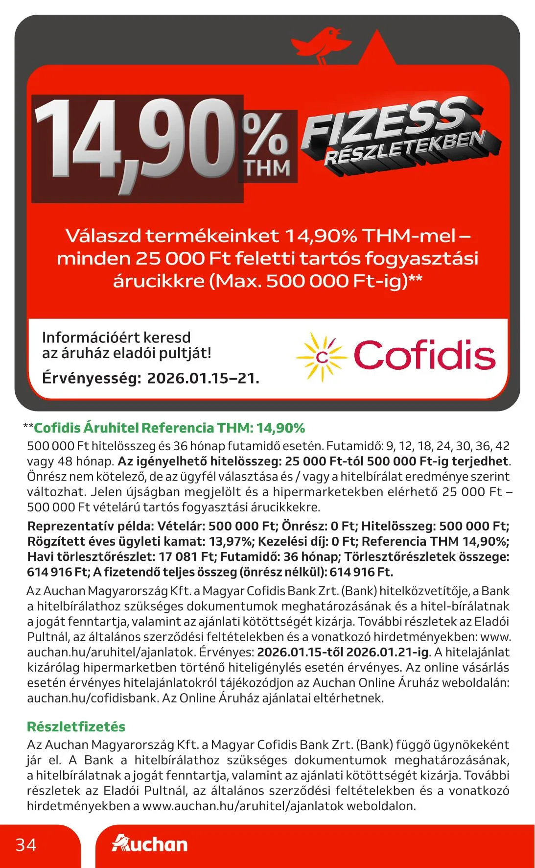 Érvényes: 2026.01.15-től 2026.01.21-ig. A hitelajánlat kizárólag hipermarketben történő hiteligénylés esetén érvényes. Az online vásárlás esetén érvényes hitelajánlatokról tájékozódjon az Auchan Online Áruház weboldalán: auchan.hu/cofidisbank. Az Online Áruház ajánlatai eltérhetnek.