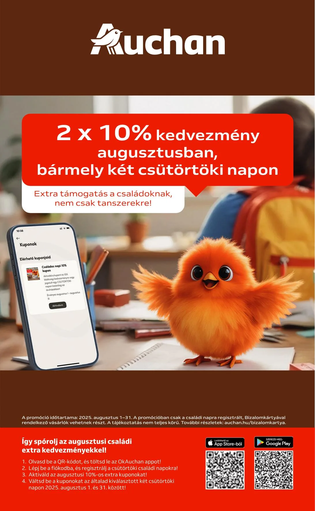A promóció időtartama: 2025. augusztus 1 – 31. A promócióban csak a családi napra regisztrált, Bizalomkártyával rendelkező vásárlók vehetnek részt. A tájékoztatás nem teljes körű. További részletek: auchan.hu/bizalomkartya.
