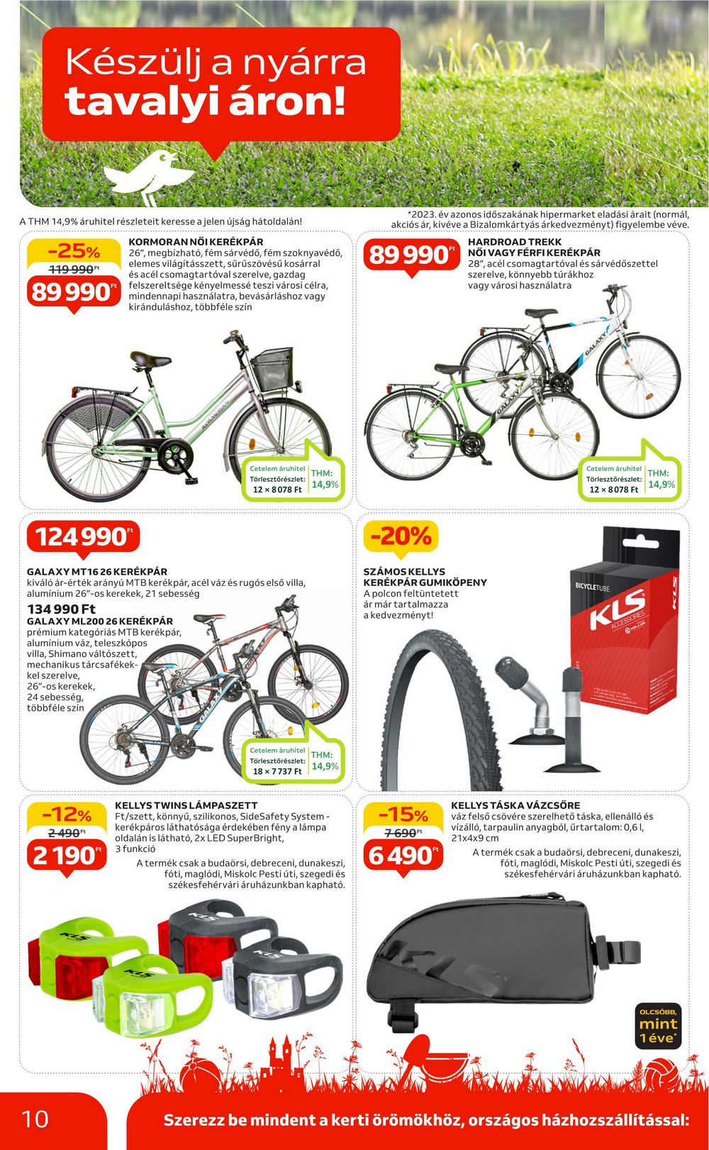 10 Készülj a nyárra tavalyi áron! A THM 14,9% áruhitel részleteit keresse a jelen újság hátoldalán! -25% 119-990Ft KORMORAN NŐI KERÉKPÁR 26″, megbízható, fém sárvédő, fém szoknyavédő, elemes világításszett, sűrűszövésű kosárral és acél csomagtartóval szerelve, gazdag felszereltsége kényelmessé teszi városi célra, 89 990 mindennapi használatra, bevásárláshoz vagy kiránduláshoz, többféle szín *2023. év azonos időszakának hipermarket eladási árait (normál, akciós ár, kivéve a Bizalomkártyás árkedvezményt) figyelembe véve. HARDROAD TREKK 89 990 NOI VAGY FÉRFI KERÉKPÁR 28″, acél csomagtartóval és sárvédőszettel szerelve, könnyebb túrákhoz vagy városi használatra Cetelem áruhitel THM: 14,9% Törlesztőrészlet: 12 x 8078 Ft ALAXY GALAXY Cetelem áruhitel Törlesztőrészlet: 12 x 8078 Ft THM: 14,9% 124990** GALAXY MT16 26 KERÉKPÁR kiváló ár-érték arányú MTB kerékpár, acél váz és rugós első villa, alumínium 26″-os kerekek, 21 sebesség 134 990 Ft GALAXY ML200 26 KERÉKPÁR prémium kategóriás MTB kerékpár, alumínium váz, teleszkópos villa, Shimano váltószett, mechanikus tárcsafékek- kel szerelve, 26″-os kerekek, 24 sebesség, többféle szín GALAX -20% SZÁMOS KELLYS KERÉKPÁR GUMIKÖPENY A polcon feltüntetett ár már tartalmazza a kedvezményt! BICYCLETUBE KLS ACCESSORIES -12% 2-490 2 190″ Cetelem áruhite! Törlesztőrészlet: 18 x 7737 Ft THM: 14,9% KELLYS TWINS LÁMPASZETT Ft/szett, könnyű, szilikonos, SideSafety System – kerékpáros láthatósága érdekében fény a lámpa oldalán is látható, 2x LED Super Bright, 3 funkció A termék csak a budaörsi, debreceni, dunakeszi, fóti, maglódi, Miskolc Pesti úti, szegedi és székesfehérvári áruházunkban kapható. -15% 7-690Ft 6490 KELLYS TÁSKA VÁZCSŐRE váz felső csövére szerelhető táska, ellenálló és vízálló, tarpaulin anyagból, űrtartalom: 0,6 1, 21x4x9 cm A termék csak a budaörsi, debreceni, dunakeszi, fóti, maglódi, Miskolc Pesti úti, szegedi és székesfehérvári áruházunkban kapható. OLCSÓBB, mint 1 éve* Szerezz be mindent a kerti örömökhöz, országos házhozszállítással: