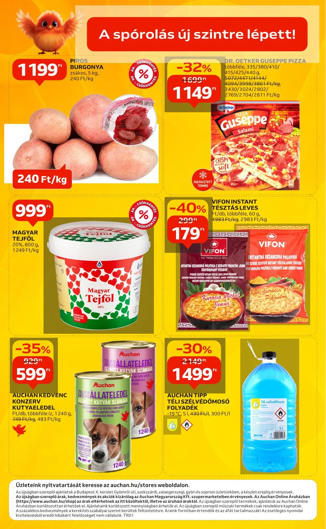 Az újságban szereplő árak, kedvezmények és akciók kizárólag az Auchan Magyarország Kft. szupermarketeiben érvényesek. Az Auchan Online Áruházban az árak eltérhetnek az itt közöltektől. Ajánlataink korlátozott mennyiségben érhetők el. A százalékos kedvezmények a kerekítés szabályai szerint kerültek feltüntetésre. Áraink forintban értendők és az áfát tartalmazzák.