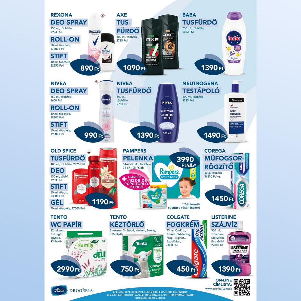 REXONA DEO SPRAY 150 ml, többféle, 5933 Ft/l ROLL-ON 50 ml, többféle, 17800 Ft/1 STIFT 40 ml, többféle 22250 Ft/1 NIVEA AXE TUS- FÜRDŐ Rexona 400 ml, többféle, 2725 Ft/1 AXE sexy bouquet exona 890 Ft DEO SPRAY 150 ml, többféle, 6600 Ft/l ROLL-ON 50 ml, többféle, 19800 Ft/l STIFT 50 ml, többféle, 19800 Ft/l OLD SPICE TUSFÜRDŐ 400 ml, többféle, 2975 Ft/1 DEO 150 ml, többf., 7933 Ft/1 STIFT 50 ml, többf., 23800 Ft/1 GÉL 70 ml, többféle, 17000 Ft/1 TENTO WC PAPÍR 32 tekercs, 3 rétegű, egyféle, 93 Ft/db 2990 Ft 990 Ft NIVEA fresh Old Sp Old Spice CASIS Family 1190 Ft Tents 3-ply 32 DELI 1090 Ft NIVEA 12H REFRESHING FRAGRANCE TUSFÜRDŐ 500 ml, többféle, 2780 Ft/1 1390 Ft PAMPERS PELENKA 54-46-38 db, többféle, 74-87-105 Ft/db AJÁNDÉK +452 DB-OS POPSITORLO KENDO TENTO KÉZTÖRLŐ 4×52 Pampers 2 tekercs, 3 rétegű, Kitchen, Strong, 375 Ft/db Tento 750 Ft AXE BABA TUSFÜRDŐ 750 ml, többféle, 1853 Ft/l 12H REFRESHING FRAGRANCE NIVEA Body Wash creme care 1390 Ft NEUTROGENA TESTÁPOLÓ 400 ml, többféle, 3725 Ft/l 500 ml 1490 Ft 3990 Ft/db* Pampers. active baby * 2db termék együttes vásárlásakor! COLGATE FOGKRÉM 75 ml, CavPro., TrolAct., Whitening. Prop., TripAct., ExtrWhite., 36000 Ft/1 Colgate Kitchen Paper towels 450 Ft COREGA baba Neutrogenar DEEP MOISTURE MŰFOGSOR- RÖGZÍTŐ 40 g, többféle, 36250 Ft/kg 1450 Ft LISTERINE SZÁJVÍZ 500 ml, TotalCare, StayWhite, ExtraMild, 2780 Ft/l COREGA LISTERINE TOTAL CARE TEETH PROTECTION Azúr DROGÉRIA AZ AJÁNLAT 2024. JÚLIUS 2-20.-16, EZEN BELÜL A KÉSZLET EREJÉIG ÉRVÉNYES. AZ ÁRAK FT-BAN ÉRTENDÓK ÉS AZ ÁFA-T TARTALMAZZÁK. AZ ESETLEGES NYOMDAI HIBÁKÉRT FELELŐSSÉGET NEM VÁLLALUNK. 1390 Ft ON-LINE CÍMLISTA: www.azur.hu/uzletek