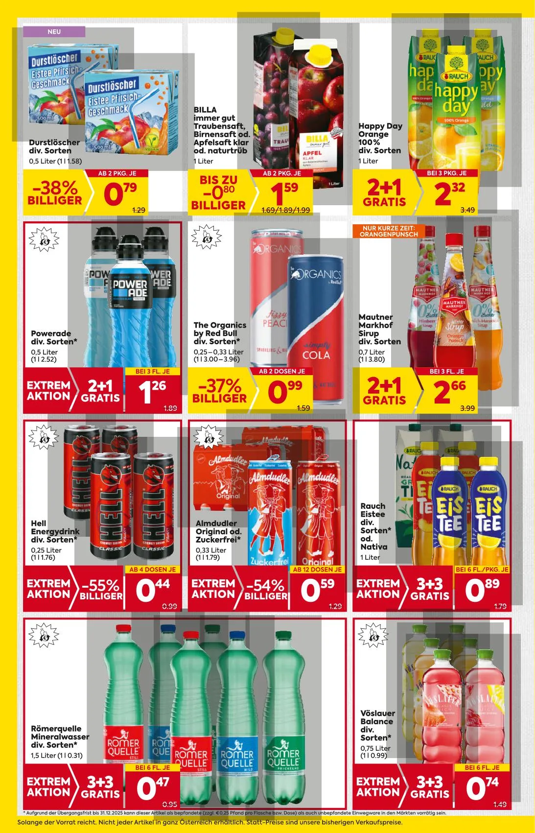 * Az átmeneti időszak miatt 2025. december 31-ig ez a termék visszaváltható (további €0,25 vissza a palackonként vagy dobozonként) és egyszer használatos termékként is elérhető a boltokban. Míg a készlet tart. Nem minden termék érhető el Ausztria egész területén. Az alternatív árak a korábbi eladási áraink.