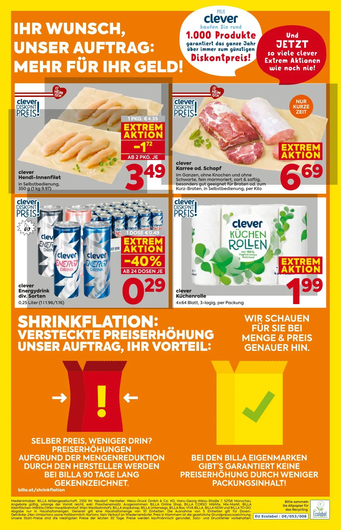 Selber Preis, weniger drin? Preissteigerungen aufgrund der Mengenreduktion durch den Hersteller werden bei BILLA 90 Tage lang gekennzeichnet. billa.at/shrinkflation
