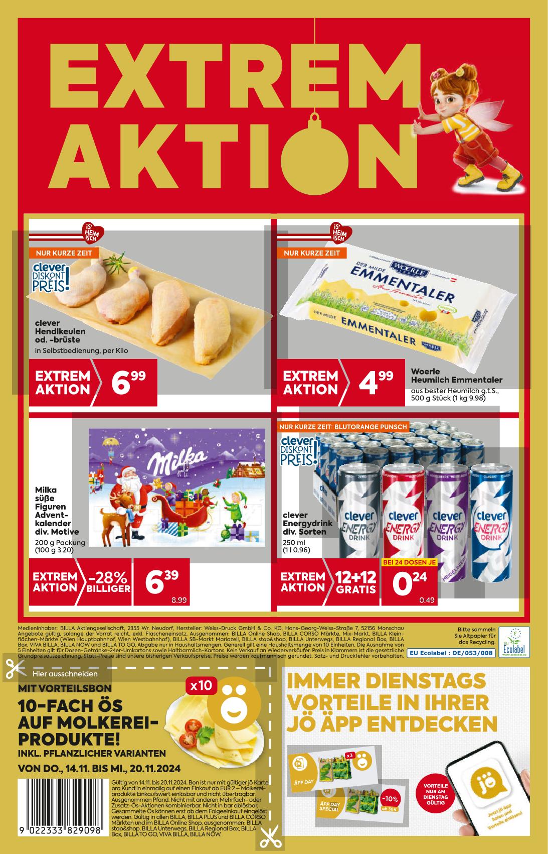 EXTREM ΑΚΤΙΟΝ HEIM ISCH NUR KURZE ZEIT clever DISKONT PREIS HEIM SCH NUR KURZE ZEIT DER MILDE EMMENTALER DER MILDE EMMENTALER clever Hendlkeulen od. -brüste in Selbstbedienung, per Kilo EXTREM AKTION 699 EXTREM AKTION 99 Woerle Heumilch Emmentaler aus bester Heumilch g.t.S., 500 g Stück (1 kg 9.98) Milka süße Figuren Advent- kalender div. Motive 200 g Packung (100 g 3.20) Milka NUR KURZE ZEIT: BLUTORANGE PUNSCH clever DISKONT PREIS! clever Energydrink div. Sorten clever clever clever clever ENERGY ENERGY ENERGY ENERG DRINK DRINK DRINK DRINK 250 ml (110.96) AKTION/BILLIGER 639 8.99 BEI 24 DOSEN JE 24 EXTREM 12+12 02 AKTION GRATIS 0.49 BEEW HEIDELBER Medieninhaber: BILLA Aktiengesellschaft, 2355 Wr. Neudorf, Hersteller: Weiss-Druck GmbH & Co. KG, Hans-Georg-Weiss-Straße 7, 52156 Monschau Angebote gültig, solange der Vorrat reicht, exkl. Flascheneinsatz. Ausgenommen: BILLA Online Shop, BILLA CORSO Märkte, Mix-Markt, BILLA Klein- flächen-Märkte (Wien Hauptbahnhof, Wien Westbahnhof), BILLA SB-Markt Mariazell, BILLA stop&shop, BILLA Unterwegs, BILLA Regional Box, BILLA Box, VIVA BILLA, BILLA NOW und BILLA TO GO. Abgabe nur in Haushaltsmengen. Generell gilt eine Haushaltsmenge von 10 Einheiten. Die Ausnahme von 5 Einheiten gilt für Dosen-Getränke-24er-Umkartons sowie Haltbarmilch-Kartons. Kein Verkauf an Wiederverkäufer. Preis in Klammern ist die gesetzliche Grundpreisauszeichnung. Statt-Preise sind unsere bisherigen Verkaufspreise. Preise werden kaufmännisch gerundet. Satz- und Druckfehler vorbehalten. — Hier ausschneiden MIT VORTEILSBON 10-FACH ÖS AUF MOLKEREI- PRODUKTE! INKL. PFLANZLICHER VARIANTEN VON DO., 14.11. BIS MI., 20.11.2024 9 022333 829098″ x10 Gültig von 14.11. bis 20.11.2024. Bon ist nur mit gültigerjö Karte pro Kund:in einmalig auf einen Einkauf ab EUR 2.- 2-Molkerei- produkte Einkaufswert einlösbar und nicht übertragbar. Ausgenommen Pfand. Nicht mit anderen Mehrfach- oder Zusatz-Ös-Aktionen kombinierbar. Nicht in bar ablösbar. Gesammelte Ös können erst ab dem Folgeeinkauf eingelöst werden. Gültig in allen BILLA, BILLA PLUS und BILLA CORSO Märkten und im BILLA Online Shop, ausgenommen: BILLA stop&shop, BILLA Unterwegs, BILLA Regional Box, BILLA Box, BILLA TO GO, VIVA BILLA, BILLA NOW. Bitte sammeln Sie Altpapier für das Recycling. EU Ecolabel: DE/053/008 IMMER DIENSTAGS VORTEILE IN IHRER JÖ ÄPP ENTDECKEN APP DAY APP DAY SPECIAL -10% ab 30€ VORTEILE NUR AM DIENSTAG GÜLTIG jö Ecolabel Jeta jo opp holen und Vortelle einiösent
