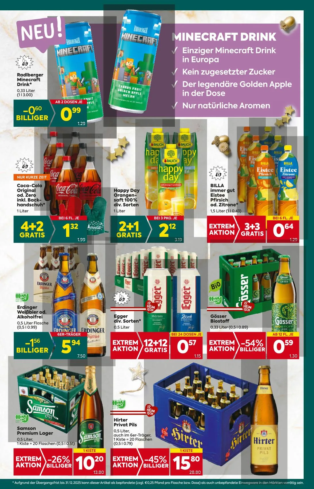 Angebote gültig, solange der Vorrat reicht, exkl. Flascheneinsatz. Ausgenommen: BILLA Online Shop, BILLA CORSO Märkte, Mix-Markt, BILLA Kleinflächen-Märkte, BILLA stop&shop, BILLA Unterwegs, BILLA Box, VIVA BILLA, BILLA NOW und BILLA TO GO.
