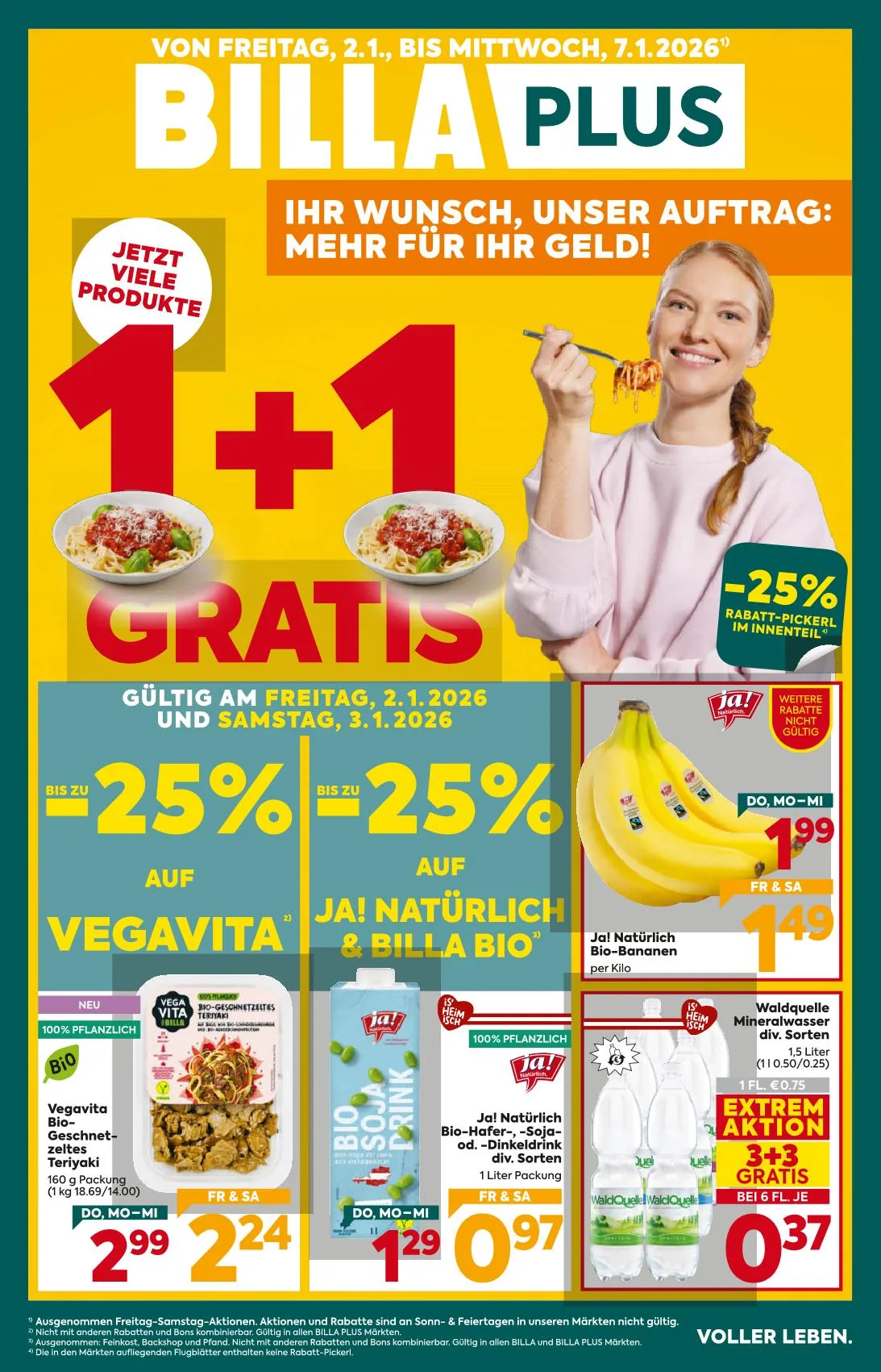 Ausgenommen Freitag-Samstag-Aktionen. Aktionen und Rabatte sind an Sonn- & Feiertagen in unseren Märkten nicht gültig. Nicht mit anderen Rabatten und Bons kombinierbar. Gültig in allen BILLA PLUS Märkten. Ausgenommen: Feinkost, Backshop und Pfand. Nicht mit anderen Rabatten und Bons kombinierbar. Gültig in allen BILLA und BILLA PLUS Märkten. Die in den Märkten aufliegenden Flugblätter enthalten keine Rabatt-Pickerl.