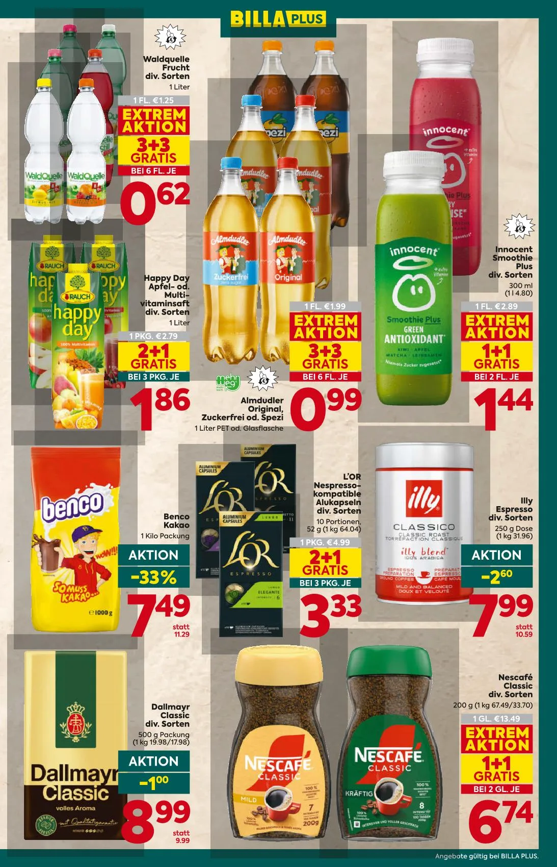 Ausgenommen Freitag-Samstag-Aktionen. Aktionen und Rabatte sind an Sonn- & Feiertagen in unseren Märkten nicht gültig. Nicht mit anderen Rabatten und Bons kombinierbar. Gültig in allen BILLA PLUS Märkten. Ausgenommen: Feinkost, Backshop und Pfand. Nicht mit anderen Rabatten und Bons kombinierbar. Gültig in allen BILLA und BILLA PLUS Märkten. Die in den Märkten aufliegenden Flugblätter enthalten keine Rabatt-Pickerl.