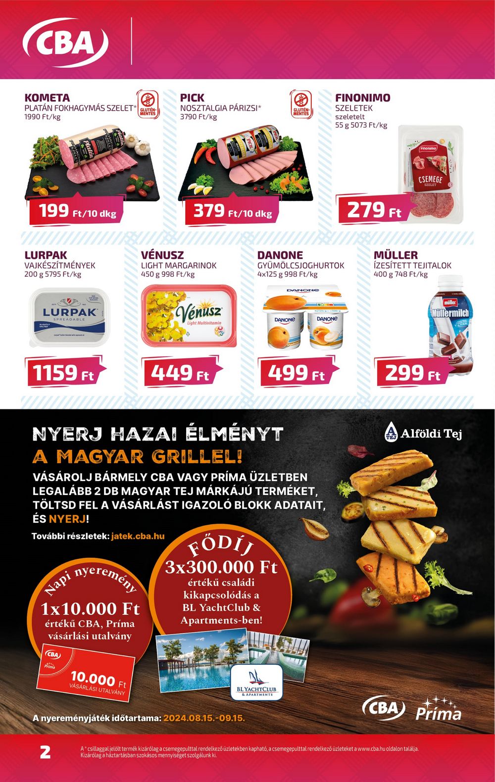 (CBA KOMETA PLATÁN FOKHAGYMÁS SZELET GLUTEN- 1990 Ft/kg MENTES PICK NOSZTALGIA PÁRIZSI* 3790 Ft/kg GLUTEN- MENTES FINONIMO SZELETEK szeletelt 55 g 5073 Ft/kg 199 Ft/10 dkg LURPAK VAJKÉSZÍTMÉNYEK 200 g 5795 Ft/kg VÉNUSZ 379 Ft/10 dkg 279 Ft CSEMEGE LIGHT MARGARINOK 450 g 998 Ft/kg DANONE GYÜMÖLCSJOGHURTOK 4×125 g 998 Ft/kg MÜLLER ÍZESÍTETT TEJITALOK 400 g 748 Ft/kg LURPAK SPREADABLE Vénusz Light Multivitamin DANONE DANONE DANONE müller Müllermilch 1159 Ft 449 Ft 499 Ft 299 Ft NYERJ HAZAI ÉLMÉNYT A MAGYAR GRILLEL! VÁSÁROLJ BÁRMELY CBA VAGY PRÍMA ÜZLETBEN LEGALÁBB 2 DB MAGYAR TEJ MÁRKÁJÚ TERMÉKET, TÖLTSD FEL A VÁSÁRLÁST IGAZOLÓ BLOKK ADATAIT, ÉS NYERJ! További részletek: jatek.cba.hu Napi nyeremény 1×10.000 Ft értékű CBA, Príma vásárlási utalvány FÖDI 3×300.000 Ft értékű családi kikapcsolódás a BL Yacht Club & Apartments-ben! CBA) 10.000 Ft BL YACHTCLUB & APARTMENTS VÁSÁRLÁSI UTALVÁNY A nyereményjáték időtartama: 2024.08.15.-09.15. N Alföldi Tej (CBA) Prima A csillaggal jelölt termék kizárólag a csemegepulttal rendelkező üzletekben kapható, a csemegepulttal rendelkező üzleteket a www.cba.hu oldalon találja. Kizárólag a háztartásban szokásos mennyiséget szolgálunk ki.