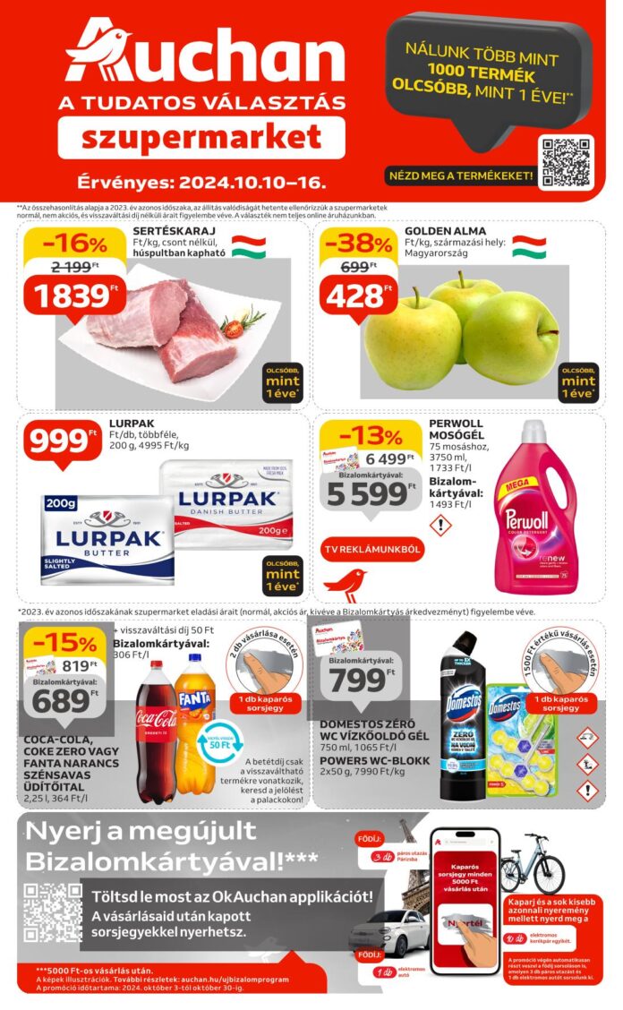 Auchan A TUDATOS VÁLASZTÁS szupermarket Érvényes: 2024.10.10-16. **Az összehasonlítás alapja a 2023. év azonos időszaka, az állítás valódiságát hetente ellenőrizzük a szupermarketek normál, nem akciós, és visszaváltási díj nélküli...
