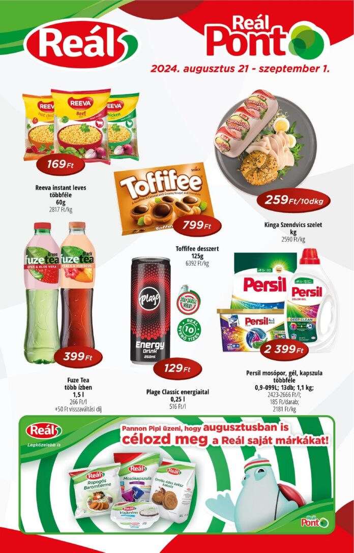 Reál Reál Pont 2024. augusztus 21 - szeptember 1. KA Spendvics Szelet KA érendvics REEV Hot chic REEVA EEVA Beef hicken 169 Ft Reeva instant leves többféle 60g 2817...