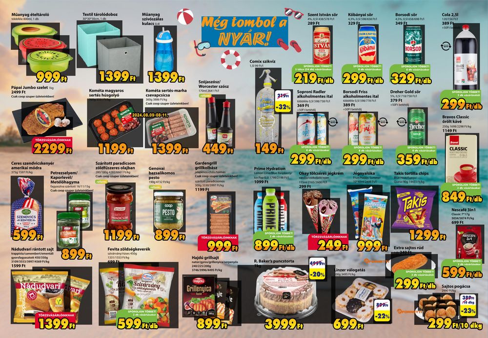 Műanyag ételtároló többféle 800ml, 1 db Textil tárolódoboz 30*30*30cm, 1 db Műanyag szívószálas kulacs 041 Még tombol a NYÁR! Szent István sör 4%, 0.51438/578 F 289 Ft Local ISTVAN Kőbányai sör 4.3% 0.51 598658 FU 329 Ft DONA NAP V Kobánya 999 Pápai Jumbo szelet k 2499 Ft Csak coop szuper üzleteinkben! 1399FT Kométa magyaros sertés húsgolyó 1399m Kométa sertés-marha csevapcsicsa 360g 3886 Ft/kg Csak coop szuperületeinkben! 2024.08.09-08-115 Szójaszósz/ Worcester szósz 170ml 2641 F refor Borsodi sör 4.5% 0,56569 349 Ft Cola 2,51 120/156 FU 389 F +50Ft b BORSOD Comix szikviz 1.5199 FU 219 -32% SPÓROLION TOBBET 1 (24 djvsárlásakor SPÓROLION TOBBETT 6 db ver SPOROLION TÖBBET 219 299 329mm Soproni Radler alkoholmentes ital többféle 0.51 598/738 FU 369 Ft +50Ft betind Fydb Borsodi Friss alkoholmentes ital többféle 0.51 598/778 F 389 Ft +50ft betétdi Dreher Gold sör 5% 0.5718/758 Fu 379 Ft +50ft bed Dreher GOLD SPOROLION TÖBBET 2 299db Bravos Classic örölt kávé 250g 1698/2298 Ft/kg 1149 Ft TÖRZSVÁSÁRLÓINKNAK 2299 Ceres szendvicskenyér amerikai módra 375g 1597 Fuk Petrezselyem/ Kaporlevél/ Metélōhagyma fagyasztva szártott 16/11/15g Csak coop szuper üzleteinkben! 1199 Szárított paradicsom zöldfűszeres olajban 280/180g 4282/6661 Ft Csak coop szuperületeinkben! exform SZÁRÍTOTT PARADICSOM 1399Ft 449FV Genovai bazsalikomos pesto 190g 4732 Ft/kg reform SZENDVICS KENYER 599 Nádudvari rántott sajt trappista/camembert/emental gyorsfagyasztott 450/3509 3109/3553/3997/4569 Ft/kg 1599 Ft ETELONAGYMA 899 Nádudvari vari соор PESTO 11.99 899 Fevita zöldségkeverék vyries 450g 1331/1553 Ft/kg 699 EL Ri Szivárvány Gardengrill grillkolbász jalapenos-chillstomas Csak coop szuper üzleteinkben! startott paradicsomos 300g 3330/3997 Ft/kg 1199 Ft TÖRZSVÁSÁRLÓINKNAK 149 Prime Hydration SPOROLION TOGET SPOROLION TOODET SPOROLION TOBBET 299 299 AND 359AND Flydb Lemon Lime/Blue Raspberry? Okey tölcséres jégkrém Ice Pop 0,511798/2198 Fuj 1099 Ft PRIME SPÓROLJON TO 115ml 2165/2600 F 299 Ft TÖRZSVÁSÁRLÓINKNAK Jégnyalóka Fruit Happy Summer 10402490 FUL PODGREJU 249 999 999P 899 FIXI Hajdú grillsajt natur/gyros/grillenyica/serpenys 240/225/2009 3746/3996/4495 Ft/kg R. Baker’s puncstorta 4999H Hajdú Grillenyica jt Takis tortilla chips Blue Heat/argola Queso 90g 14433 Ft/kg Takis CLASSIC SPÓROLJON TOBBET! 849 Arch 1299m Extra sajtos rúd Nescafé 3in1 Classic 7*179 5034/5874 Ft/kg 699 Ft NESCAPE 3/1 -20% Linzer válogatás 00g 3495 Ft/kg SPOROLION TOBBET 299 PXAD SPOROLION TOBBET 2 db v 599FVAL Sajtos pogácsa 2990 Ft 389F 10 dkg TÖRZSVÁSÁRLÓINKNAK 1399 SPOROLION TÖBBET 599 809 -22% Dron -23% 899FT 3999. 699 Ft 299 Ft/10 dkg