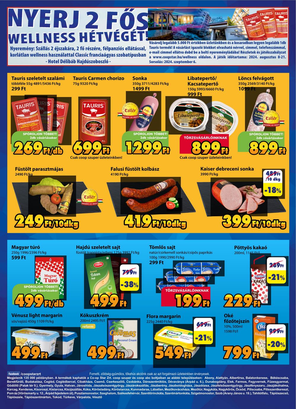 NYERJ 2 FŐSEN WELLNESS HÉTVÉGÉT! Nyeremény: Szállás 2 éjszakára, 2 fő részére, félpanziós ellátással, korlátlan wellness használattal Classic franciaágyas szobatípusban -Hotel Délibáb Hajdúszoboszló- TAURIS TAURIS TAURIS Vásárolj legalább 5.000 Ft értékben üzletünkben és a kosaradban legyen legalább 1db Tauris termék! A vásárlást igazoló blokkot olvasható névvel, címmel, telefonszámmal, a www.coopstar.hu/wellness oldalon. A játék időtartama: 2024. augusztus 8-21. e-mail címmel ellátva dobd be a bolti nyereményládába! Részletek és játékszabályzat Sorsolás: 2024. szeptember 6. Tauris szeletelt szalámi többféle 55g 4891/5436 Ft/kg 299 Ft TAURIS URIS RIS Pa SPÓROLJON TÖBBET! 2db vásárlásakor Tauris Carmen chorizo 75g 9320 Ft/kg TAURIS 269 699 нь Füstölt parasztmájas 2490 Ft/kg Csak coop szuper üzleteinkben! Sonka 350g 3711/4283 Ft/kg 1499 Ft Tallér Caller EGERA ANKA 350g SPÓROLJON TÖBBET! 2db vásárlásakor 1299 Ft Falusi füstölt kolbász 4190 Ft/kg Libatepertő/ Kacsatepertő 150g 5993/6660 Ft/kg 999 Ft Libateperto csateperto TÖRZSVÁSÁRLÓINKNAK 899.Ft Csak coop szuper üzleteinkben! Löncs felvágott 350g 2569/3140 Ft/kg 1099 Ft LONG 350 Tallér SPÓROLJON TÖBBВЕТ! 2db vásárlásakor 899P Kaiser debreceni sonka 3990 Ft/kg 489 10 dkg -18% 249muda Tallér 419 Fynodky 399m Tche Magyar túró 250g 1996/2396 Ft/kg 599 Ft Magyar Túró SPÓROLJON TÖBBET! 2db vásárlásakor 499mydb Vénusz light margarin sós/vajízü 450g 1109 Ft/kg 499m Hajdú szeletelt sajt füstölt trappista/edami 125g 3992 Ft/kg Saiht Hajdu Edam Sept Tömlős sajt natúr/csirkemell sonkás/csípős paprikás 100g 1990/2990 Ft/kg 299 Ft 799Ft sta -38% 499 Ft Flora margarin 225g 2440 Ft/kg 699Ft Flora -21% 549 Kókuszkrém 200ml 2495 Ft/l reform Cholmes Coconut Cream 499m Nat Pöttyös kakaó 200ml, 1145 Ft/l 289H TÖRZSVÁSÁRLÓINKNAK Pou -21% KAKA 199Ft 229F Oké fōzōtejszín 10%, 500ml 1598 Ft/l Fózótejsz 799 F -20% Oke 999Ft facebook /coopstarzrt Fornetti, zöldség-gyümölcs, tökehús akciónk csak az azt forgalmazó üzleteinkben érvényesek. Megjelenik 135 000 példányban. A termékek kaphatók a Co-op Star Zrt. coop szuper és coop abc boltjaiban az alábbi településeken: Abony, Alattyán, Albertirsa, Balatonkenese, Békéscsaba, Berekfürdő, Budakalász, Cegléd, Ceglédbercel, Cibakháza, Csemő, Cserkeszőlő, Csobánka, Dánszentmiklós, Dévaványa (Árpád u. 6.), Dunabogdány, Elek, Farmos, Fegyvernek, Füzesgyarmat, Gödöllő (Patak tér 9.), Gyermely, Gyula, Hatvan, Jánoshida, Jászalsószentgyörgy, Jászárokszállás, Jászberény, Jászboldogháza, Jászdózsa, Jászfelsőszentgyörgy, Jászfényszaru, Jászjákóhalma, Karcag, Kenderes, Kisoroszi, Kistarcsa, Kisújszállás, Kóka, Körösladány, Köröstarcsa, Kunmadaras, Lábatlan, Mezőkovácsháza, Mezőtúr, Nagykáta, Nagykörös, Öcsöd, Piliscsaba, Pilisszentkereszt, Pomáz (Vörösmarty u. 12., Árpád fejedelem út), Pusztamonostor, Szeghalom, Székesfehérvár, Szentlőrinckáta, Szentmártonkáta, Szigetmonostor, Szob (Arany János u. 19.), Tahitótfalu, Tápiószecső, Tápiószele, Tápiószentmárton, Tokod, Túrkeve, Várpalota, Vésztő