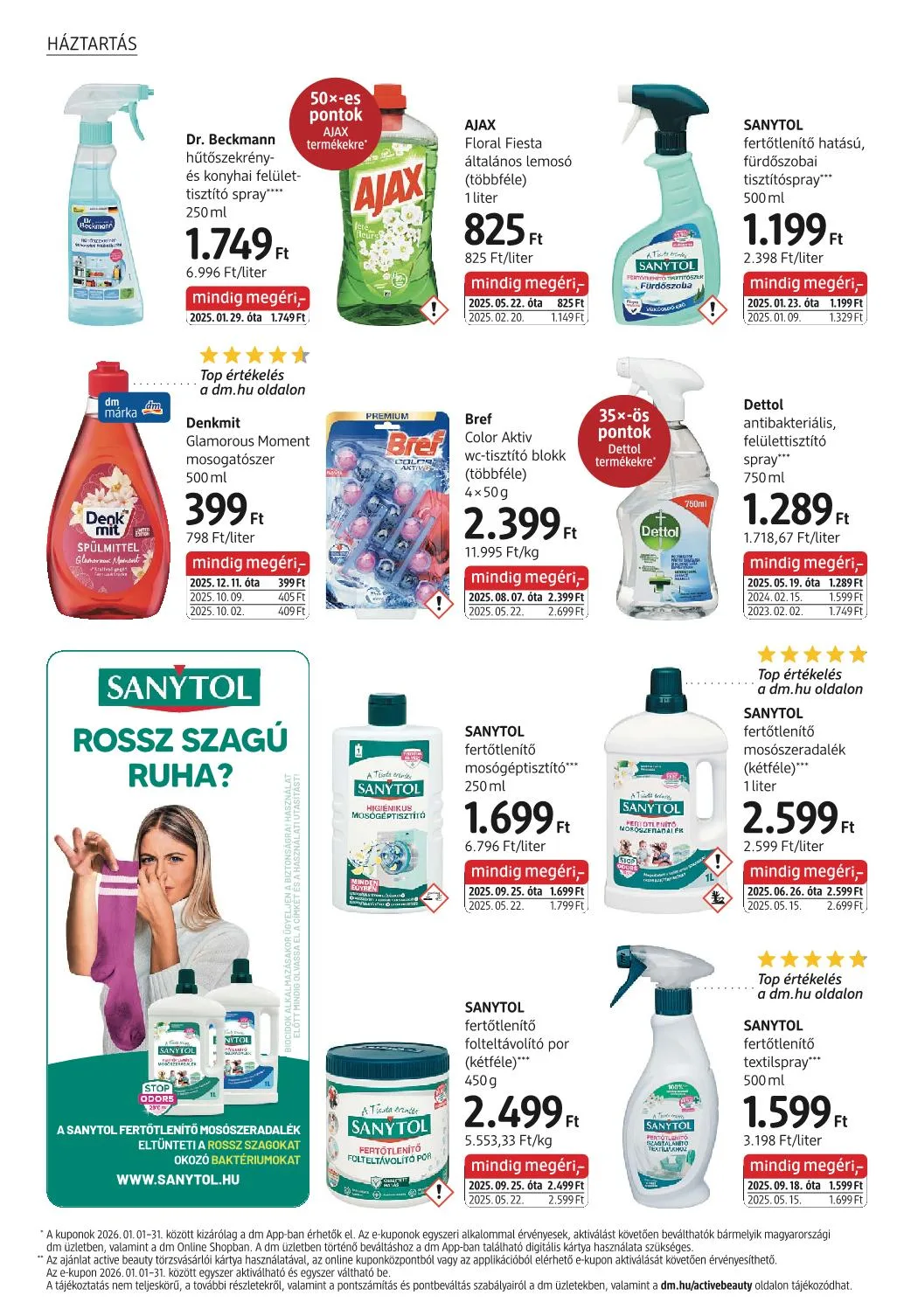 A SANYTOL fertőtlenítő mosószeradalék eltünteti a rossz szagokat okozó baktériumokat. A kuponok 2026.01.01-31. között kizárólag a dm App-ban érhetők el. Az e-kuponok egyszeri alkalommal érvényesek, aktiválást követően beválthatók bármelyik magyarországi dm üzletben, valamint a dm Online Shopban. Az ajánlat active beauty törzsvásárlói kártya használatával, az online kuponközpontból vagy az applikációból elérhető e-kupon aktiválását követően érvényesíthető.