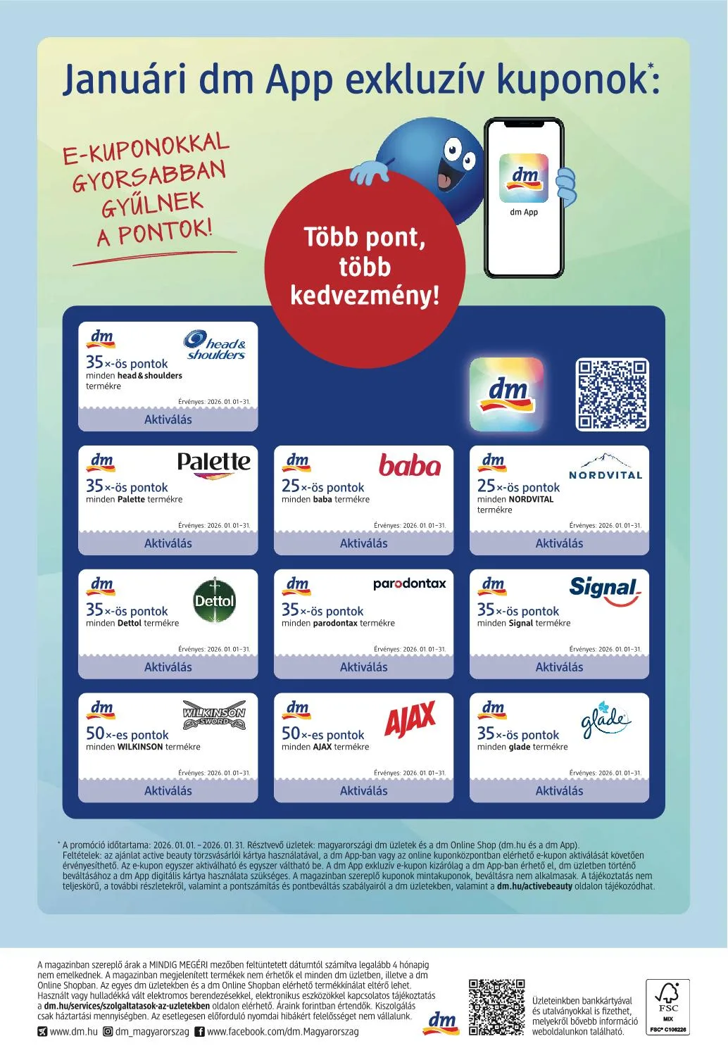 * Az ajánlat active beauty törzsvásárlói kártya használatával, az online kuponközpontból vagy az applikációból elérhető e-kupon aktiválását követően érvényesíthető. Az e-kupon 2026.01.01-31. között egyszer aktiválható és egyszer váltható be. A tájékoztatás nem teljeskörű, a további részletekről, valamint a pontszámítás és pontbeváltás szabályairól a dm üzletekben, valamint a dm.hu/activebeauty oldalon tájékozódhat.