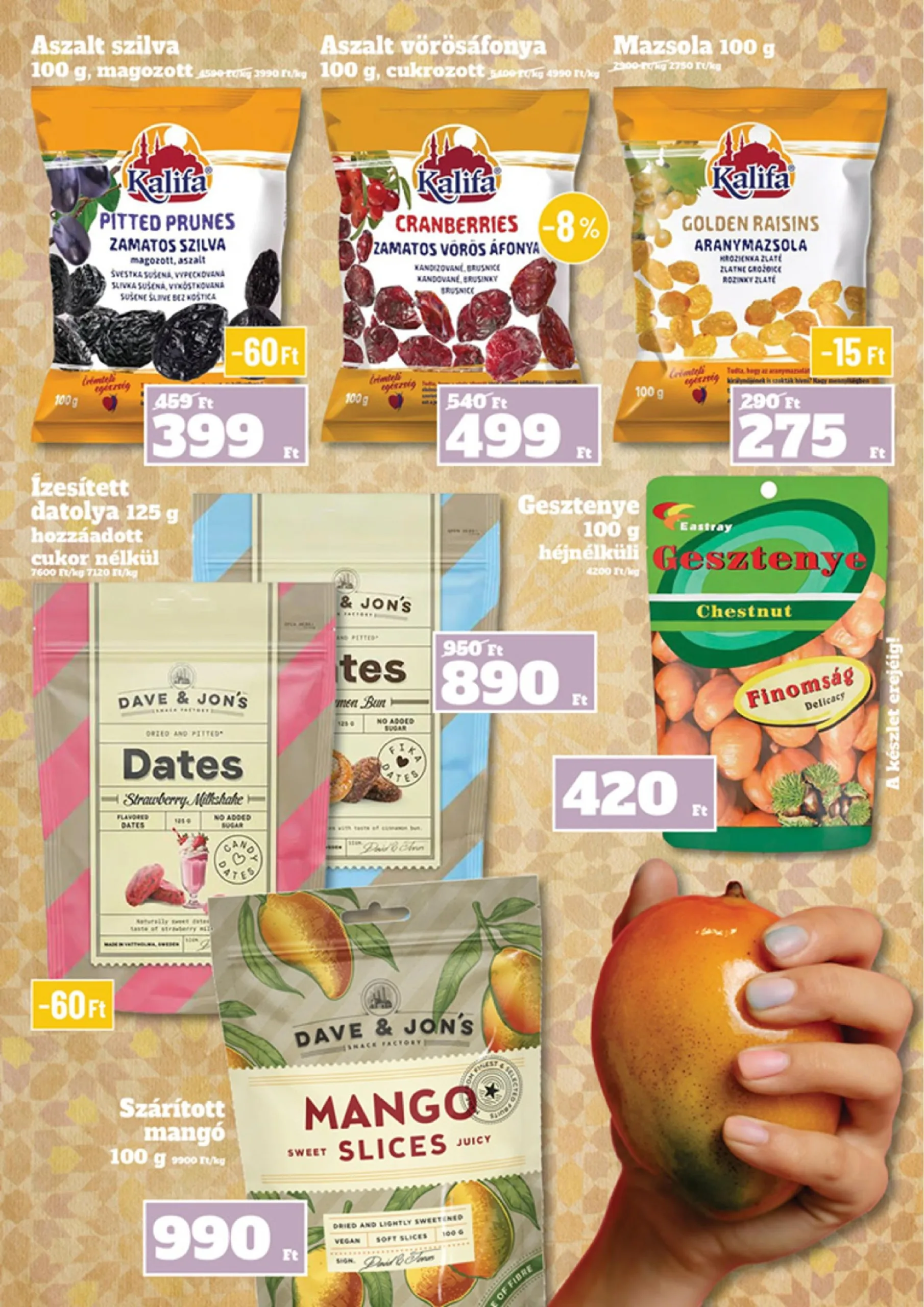 - DAVE & JON’S: Édes datolya: 100 g NO ADDED SUGAR – 7600 Ft/kg