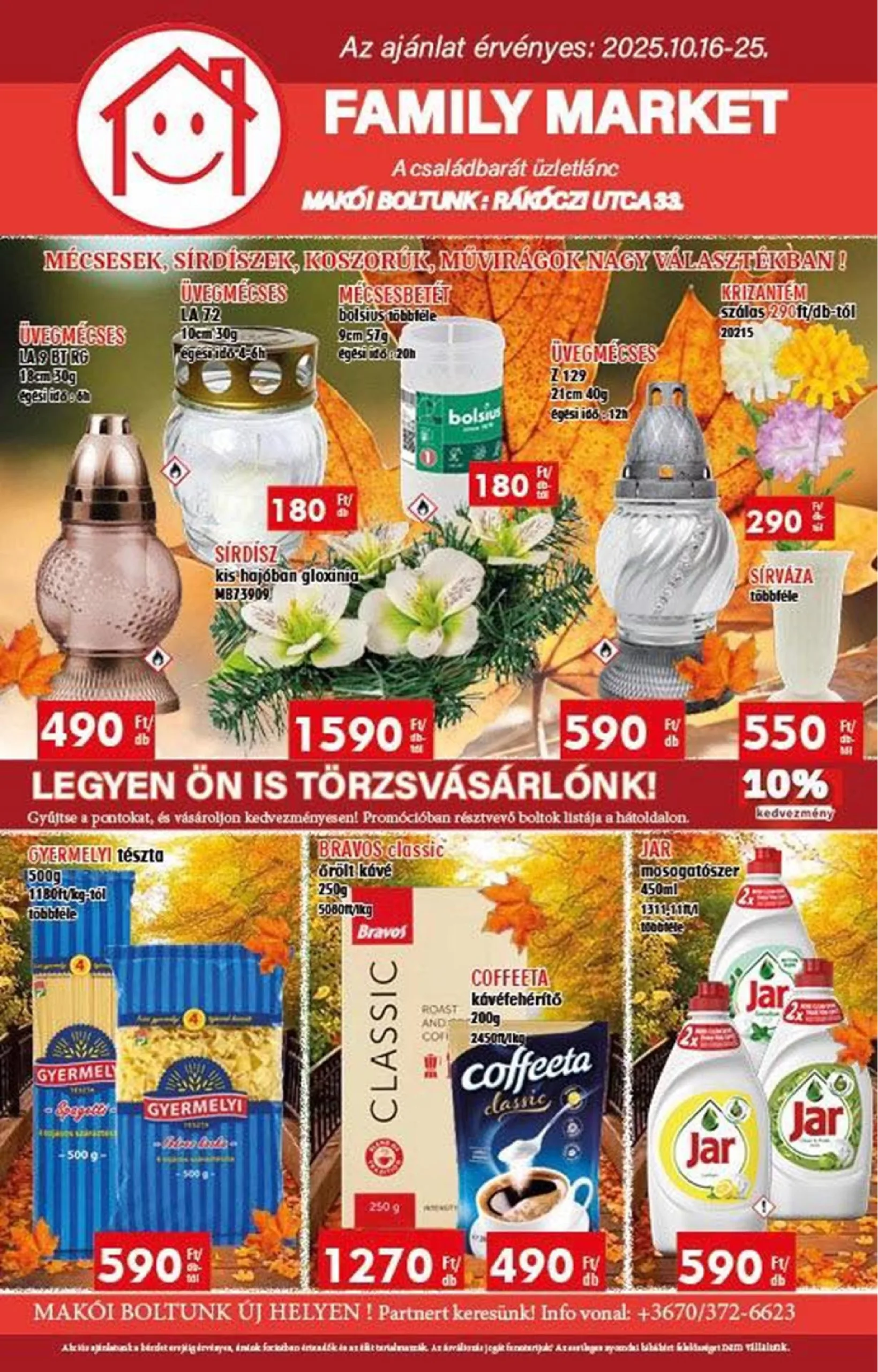 Eco FamilyÉlelmiszerHeti Family Market Akciós Újság 2025.10.16. Csütörtöktől Érvényesség kezdete: 20251016 Érvényesség Vége: 20251025 Szerkesztette: Szilveszter Közzétéve: 2025.12.07. Megosztás: FacebookTwitterPinterestWhatsApp FAMILY MARKET A családbarát üzletlánc Makói boltunk: Rákóczi utca 33. Mécsesek, sírdíszek, koszorúk, művirágok nagy választékban! Üvegmécses LA 9 BTRG – 18 cm, 30 g, égési idő: 89 dh Üvegmécses betét – Bolsius többlet, LA 72, 10 cm, 30 g, 9 cm, 57, égési idő: 4-6 h Üvegmécses – Z129, 21 cm, 40 g, égési idő: 12 h Krizantém Szálas, 290 Ft/db-tól Sírdísz 180 RV, kis hajóban gloxinia, MB73909, 290 Ft/db Sirvaza, többféle, 490 RV, Ft/db Gyermelyi tészta 1180 Ft/kg-tól, többféle Bravos classic őrölt kávé 250 g, 5080 Ft/kg Jar mosogatószer 450 ml, 1000 tele, 10% kedvezmény Coffeeta kávéfehérítő 200 g, 24501 Ft/kg Legyen Ön is törzsvásárlónk! Gyűjtse a pontokat, és vásároljon kedvezményesen! Promócióban résztvevő boltok listája a hátoldalon. Makói boltunk új helyen! Partnert keresünk! Info vonal: +3670/372-6623 Az ajánlat érvényes: 2025.10.16-25. A hirdetésünk a bérlet időtartamáig érvényes, a feltüntetett árak forintban értendők, és az árváltozás jogát fenntartjuk. Következő oldal betöltésePages: 1234 Szilveszterhttps://lapozhato-akcios-ujsag.hu Megosztás FacebookTwitterPinterestWhatsApp Akciós Újság Feliratkozás Feliratkozás ━ Hasonló Újságok Coop Coop Nyírzem Akciós Újság 2025.10.24. Péntektől 2025.12.07. 0 30 Coop - Éve Együtt Érvényes a Nyírzemplén Zrt. és a Szabolcs-Coop Zrt. üzleteiben Ajánlatunk csak a... Coop Coop Mecsek Akciós Újság 2025.10.24. Péntektől 2025.12.07. 0 30 Co-op Éve együtt Mini ABC szuper ... Diszkont Lidl Romania Akciós Újság 2025.10.20. Hétfőtől 2025.12.07. 0 LiDL de luni, 20.10 până duminică, 26.10 Ştii că merită. ... Auchan Auchan Hipermarket Karácsonyi Játék Akciós Újság 2025.10.23. Csütörtöktől 2025.12.07. 0 Auchan Érvényes: 2025.10.24 - 11.26. hipermarket Pipálj ki mindent a gyerekek kívánságlistájáról! ... Diszkont Lidl Nonfood Akciós Újság 2025.10.22. Szerdától 2025.12.07. 0 10.22. szerdától LIDL Kényelmes alapdarabokat választani igazán megéri. EsmaraⓇ Női... Előző ÚjságLidl Romania Akciós Újság 2025.12.08. HétfőtőlKövetkező ÚjságFull Diszkont Akciós Újság 2025.10.06. Hétfőtől