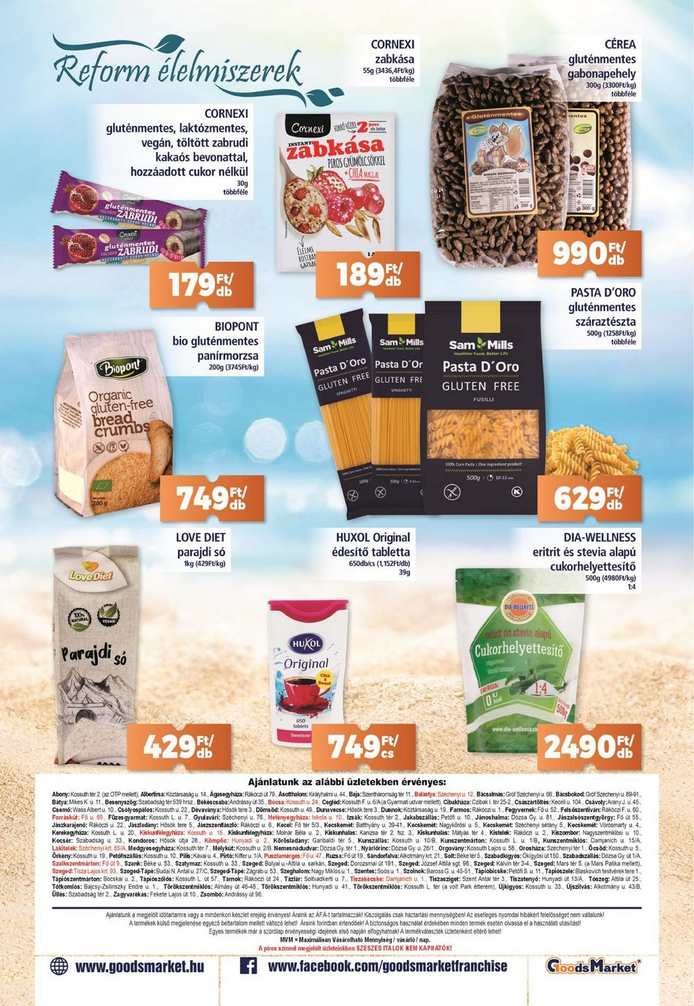 Reform élelmiszerek CORNEXI gluténmentes, laktózmentes, vegán, töltött zabrudi kakaós bevonattal, hozzáadott cukor nélkül 30g Cornexi CORNEXI zabkása 55g (3436,4Ft/kg) többféle zabkása PIROS GYÜMÖLCSÖKKEL +CHIA MACCA gluténmentes ZABRUDI többféle Gluténmentes CÉREA gluténmentes gabonapehely 300g (3300Ft/kg) többféle Connext glutenRUDI TOLYON ZABRUD 1795 Biopont Organic gluten-free BIOPONT bio gluténmentes panírmorzsa 200g (3745Ft/kg) ÉLELMI ROSTBAN GAZDA 1895 Sam Mills Sam Mills Pasta D’Oro GLUTEN FREE SPAGHETT Pasta D’Or GLUTEN FRE SPAGHETTI Sam Mills Pasta D’Oro GLUTEN FREE FUSILLI Ft/ 9909 / PASTA D’ORO gluténmentes száraztészta 500g (1258Ft/kg) többféle bread, crumbs 800 7495 LOVE DIET parajdi só 1kg (429Ft/kg) Love Diet HUXOL Original édesítő tabletta 650db/cs (1,152Ft/db) 39g 100% Corn Pasta One ingredient product 500g 10-12- 629 Ft/ DIA-WELLNESS eritrit és stevia alapú cukorhelyettesítő 500g (4980Ft/kg) 1:4 Parajdi só 429 Ft/ HUXOL Original tablets Sweetener 74959 Ajánlatunk az alábbi üzletekben érvényes: DIA WELLNESS eritrit és stevia alapú Cukorhelyettesítő sigoteres ENERGIA 0 www.dia-wellness.co 2490 Ft/ Abony: Kossuth tér 2 (az OTP melet), Albertirsa: Köztársaság u. 14, Ágasegyháza: Rákóczi út 79, Ásotthalom: Királyhalmi u. 44, Baja: Szentháromság tér 11., Balástya: Széchenyi u 12. Bácsalmás: Gróf Széchenyi u. 66, Bácsbokod Gróf Széchenyi u. 89-91.. Bátya: Mikes K. u. 11, Besenyszög: Szabadság tér 539 hrsz., Békéscsaba:Andrássy út 35., Bócsa: Kossuth u. 24 Cegléd: Kossuth F. u. 6/A (a Gyarmati udvar mellett), Cibakháza: Czibak I tér 25-2, Császártöltés: Keceli u. 104, Csávoly:Arany J. u. 45. Csemő: Wass Albert u. 10. Csólyospálos: Kossuth u. 22, Dévaványa: Hösök tere 3. Dömsöd: Kossuth u. 49. Dunavecse: Hősök tere 3, Dusnok: Köztársaság u. 19. Farmos: Rákóczi u. 1, Fegyvernek: Fou 52. Felsószentiván: Rákóczi F. u. 60. Forráskút: Fő u. 69. Füzesgyarmat: Kossuth L. u. 7., Gyulavári: Széchenyi u. 76, Hetényegyháza: Iskola u. 10. Izsák: Kossuth tér 2. Jakabszállás: Petos u. 10., Jánoshalma: Dózsa Gy. u. 81, Jászalsószentgyörgy: Fő út 55. Jászkarajenő: Rákóczi u. 22, Jászladány: Hösök tere 5, Jászszentlászló: Rákóczi u. 6, Kecel: Fő tér 5/3, Kecskemét: Batthyány u. 39-41., Kecskemét: Nagykőrösi u. 5, Kecskemét Széchenyi sétány 5., Kecskemét: Vörösmarty u. 4., Kerekegyháza: Kossuth L. u. 20, Kiskunfélegyháza: Kossuth u. 15, Kiskunfélegyháza: Molnár Béla u. 2, Kiskunhalas: Kanizsa tér 2. fsz. 3, Kiskunhalas: Matyás tér 4, Kistelek: Rákóczi u. 2, Kiszombor: Nagyszentmiklósi u. 10. Kocsér: Szabadság u. 33, Kondoros: Hósok útja 28, Kömpöe: Hunyadi u. 2, Körösladány: Garibaldi tér 5., Kunszállás: Kossuth u. 10/B, Kunszentmárton: Kossuth L. u. 1/B, Kunszentmiklós: Damjanich u. 15/A, Lakitelek: Széchenyi krt. 65/A Medgyesegyháza: Kossuth tér 7., Mélykút: Kossuth u. 2/B, Nemesnádudvar: Dózsa Gy. tér 1., Nyárlórine: Dózsa Gy. u. 26/1, Orgovány: Kossuth Lajos u. 58., Orosháza: Széchenyi tér 1.. Öcsöd: Kossuth u. 5. Örkény: Kossuthu 19, Petöfiszállás: Kossuth u. 10. Pilis: Káva u 4 Pirtò: Kiffer u 1/A, Pusztamérges: Fóu 47 Ruzsa: Fó út 19 Sándorfalva: Alkotmány krt 21, Solt: Béke tér 5 Szabadkigyós: Okígyósi út 150, Szabadszállás: Dózsa Gy. út 1/A Szalkszentmárton: Fő út 9., Szank: Béke u. 53., Szatymaz: Kossuth u. 33., Szeged: Bolyai u-Attila u. sarkán, Szeged: Dorozsmai út 191., Szeged: József Attila sgt. 96. Szeged: Kálvin tér 3-4., Szeged: Mars tér 5. (a Mars Patika mellett). Szeged: Tisza Lajos krt. 93, Szeged-Tape: Budai N. Antal u 27/C, Szeged-Tape: Zágráb u. 53, Szeghalom: Nagy Miklós u. 1., Szentes: Soós u. 1., Szolnok: Baross G. u. 45-51, Tapiobicske: Petőfi S. u. 11, Tápiószele: Blaskovich testvérek tere 1. Tápiószentmárton: Bocskai u. 2, Tápiószólós: Kossuth L. út 57., Tárnok: Rákóczi út 24, Tázlár: Soltvadkerti u. 7., Tiszakécske: Damjanich u. 1., Tiszasziget: Szent Antal tér 3., Tiszatenyó: Hunyadi út 13/A, Tószeg: Attila út 25., Tótkomlós: Bajcsy-Zsilinszky Endre u. 1. Törökszentmiklós: Almásy út 46-48. Törökszentmiklós: Hunyadi u. 41, Törökszentmiklós: Kossuth L. tér (a volt Park étterem). Újkígyós: Kossuth u. 33, Újszilvás: Alkotmány u. 43/B, Üllés: Szabadság tér 2, Zagyvarèkas: Fekete Lajos út 10. Zsombó: Andrássy út 96. Ajánlatunk a megjelölt időtartamra vagy a mindenkori készlet erejéig érvényes! Áraink az ÁFÁ-t tartalmazzák! Kiszolgálás csak háztartási mennyiségben! Az esetleges nyomdai hibákért felelősséget nem vállalunk! A termékek külső megjelenése egyezò beltartalom mellett változó lehet! Áraink forintban értendőek! A biztonságos használat érdekében minden termék esetén olvassa el a használati utasitást! Egyes termékek már a szórólap érvényességi idejének első napján elfogyhatnak! A termékválaszték üzletenként eltérő lehet! www.goodsmarket.hu MVM Maximálisan Vásárolható Mennyiség/ vásárló/ nap. A piros szinnel megjelölt üzleteinkben SZESZES ITALOK NEM KAPHATÓK! fwww.facebook.com/goodsmarketfranchise Goods Market
