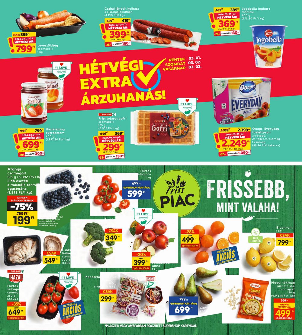 CSAK: 899 2024.03.01-03. HÉTVÉGI ÁR: 799 Leveszöldség csomagolt 1 kg Edradgem Szamóca 2213 Áfonya csomagolt 125 g (6.392 Ft/1 k 2 db esetén a második term egységára: (1.592 Ft/1 kg) MINDEN MÁSODIK TERMÉK -75% 799 Ft 199 Ft SPARO HAZAI SZERETE 999″ 799 Háziasszony extradzsem 2024.03.01-03. HÉTVÉGI ÁR: 400 g 699 (1.747.50 Ft/1 kg) -30% SPÓROLÁS 300 Fürtös szilvapa csomag 250 g (2.596 F -35% Den 649″ Spórolás: 350 Fr D #1 LOVE hazai Andradgom Jabarack (1.997.50 Ft/1 kg) közül mettes megvásárlása esetén érvényes ārkedvezmény Csok laska csoma (1.830 CSAK 549″ 300 #I LOVE hazai Csabai lángolt kolbász a kiszolgálópultban (4.190 Ft/1 kg) 559 HATÓSÁGI AKCIÓS ELELMISZERKOSÁR 2024.03.01-03. HÉTVÉGI ÁR: Ft 399 (3.990 Ft/1 kg) -28% SPOROLAS: 160″ HÉTVÉGI EXTRA ÁRZUHANÁS! 419″ SPAR Friss tojásos gofri csomagolt 125 g (2.952 Ft/1 kg) 449″ 369″ 2024.03.01-03. HÉTVÉGI ÁR: 299Ft (2.392 Ft/1 kg) -33% SPÓROLÁS: 150 www CSAK 349″ F Káposztamix BRA ININUT PR magolt 180 g (1.6 1/1 kg) CSAK 299″ 699 Ft „SUPERSHOP KARTYÁVAL 599″ X Fürtös adicsom 1 kg Picnic #I LOVE hazai Green -20% un 399″ TANT alma Spórolds: 100 Ft 1 kg (2) PÉNTEK 03.01. SZOMBAT 03. 02. VASÁRNAP 03.03. COPANES FAITS TOJAGOS Gofri 125 HAZAI TERMER 60 #I LOVE hazal 15 Friss PIAC -28% 2007 n 499″ Spórolás: 200 Ft 799 Ft *SUPERSHOP KÁRTYÁVAL 699 Ft Conf kör *PLASZTIK VAGY MYSPARBAN RÖGZÍTETT SUPERSHOP KÁRTYÁVAL! 499″ 2024.03.01-03. HÉTVÉGI ÁR: Ft 389″ Jogobella joghurt többféle 400 g (972.50 Ft/1 kg) 369 (922.50 Ft/1 kg) -26% SPOROLAS: 130 100% S Ooops! EVERYDAY Peach SMOOTH SOFTNESS 3.339″ Zott Jogobella 2024.03.01-03. HÉTVÉGI ÁR: 2.249 (93.71 Ft/1 tekercs) -32% SPOROLAS 1.090 2.399 Ooops! Everyday toalettpapir 3-rétegű: HATÓSÁGI AKCIOS ELELMISZERKOSAR FRISSEBB, MINT VALAHA! 24 tekercs/csomag Ft 1 csomag (99.96 Ft/1 tekercs) BIO TERMÉK mogyi TÜKMAG Biocitrom 1 kg CSAK 799″ Mogyi tökmag piritott: sós: csomagolt 130 g (6.146.15 Ft/1 kg) 799″ MYSPAR KUPONNAL: 499” (3.838,46 Ft/1 kg